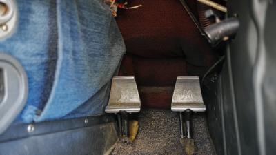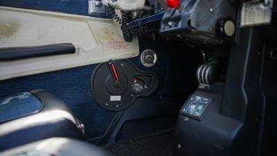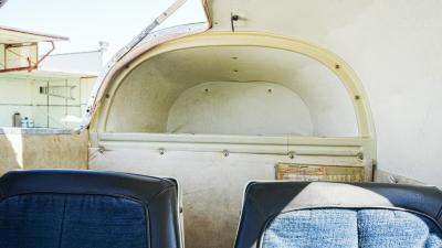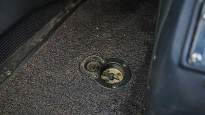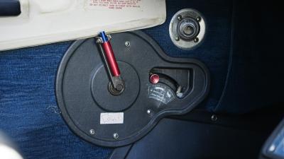 Navy leather and cloth seating with beige side panels and newer floor carpeting. Seat coverings and carpet are in great shape. Trim plastics and headliner are showing their age.