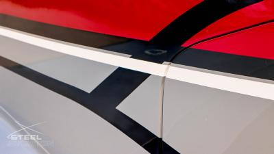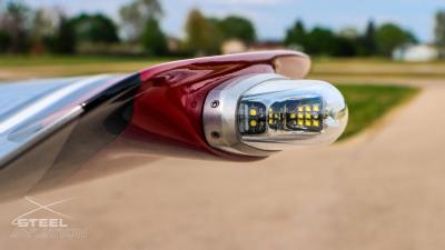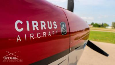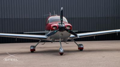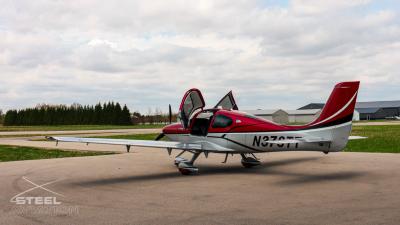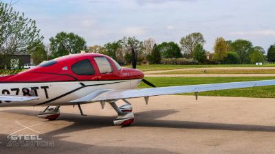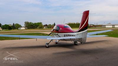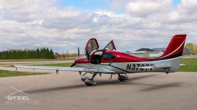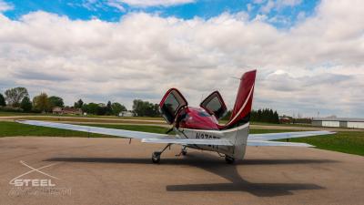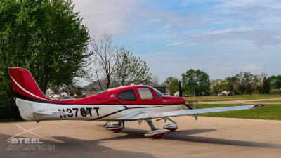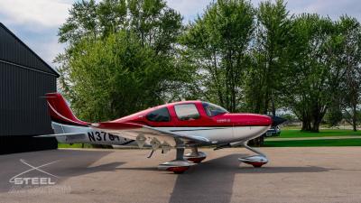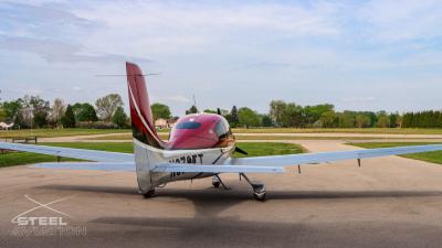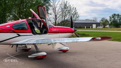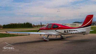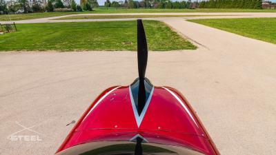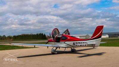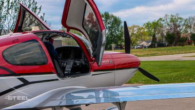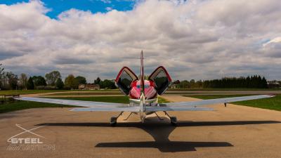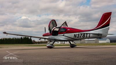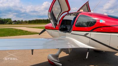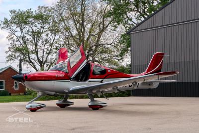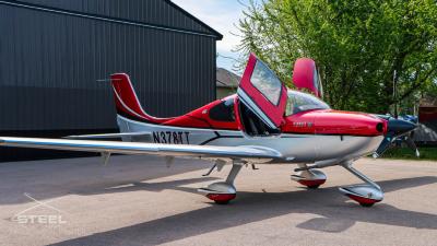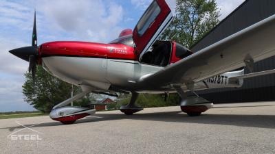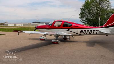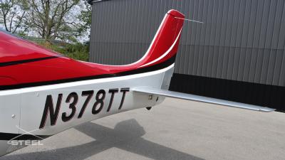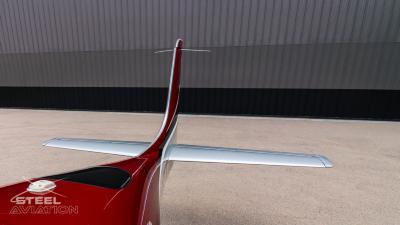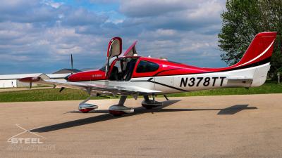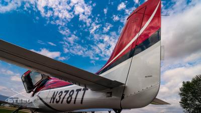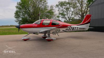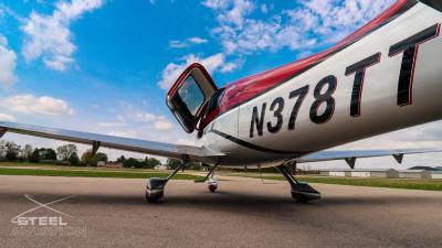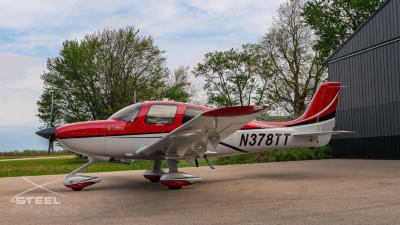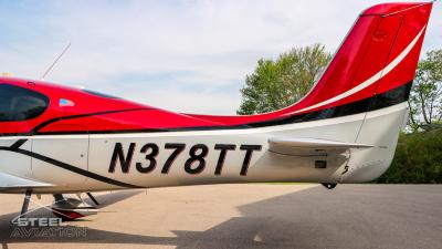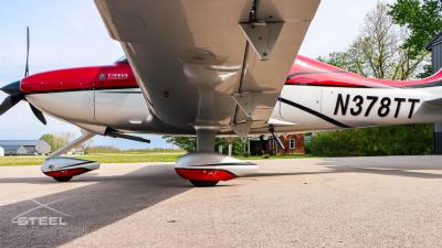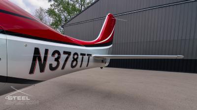 Draped in a striking red-and-silver custom scheme that looks fast even standing still, N378TT carries itself with a quiet confidence. The lines are clean, purposeful, almost predatory—like it knows exactly what it was built to do. Slide closer and you start to notice the details: the sculpted wheel fairings, the smooth composite curves, the way the paint catches light like polished metal at speed.