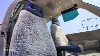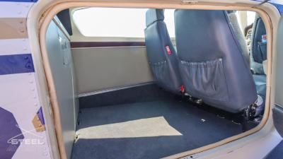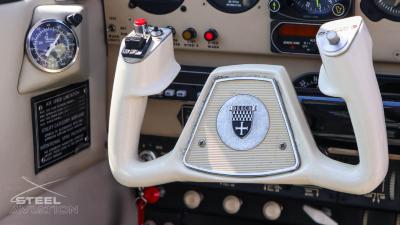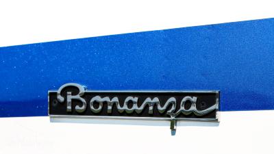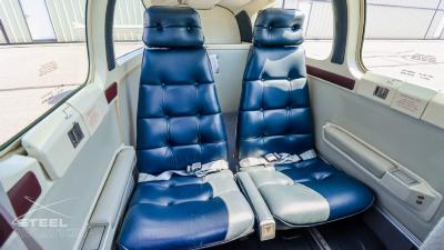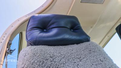 Blue leather seating with beige paneling and grey carpeting. Front seats feature beige sheepskin covers. All interior appointments are in nice condition for the vintage. Headliner was replaced in October 2005 and seatbelts were refurbished by Amsafe in July 2007.