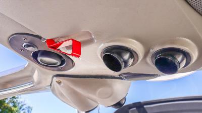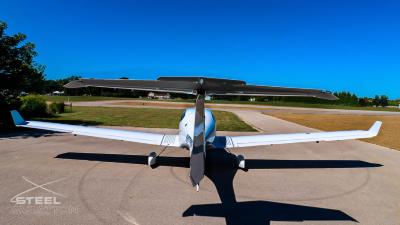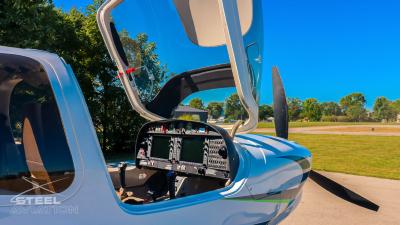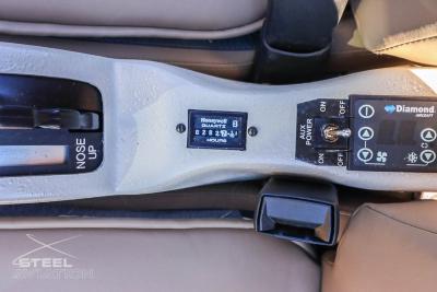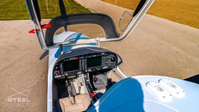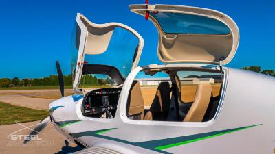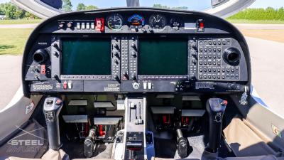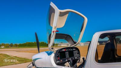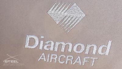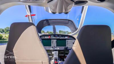 The interior is clean and well-kept with light tan leather seats and matching side panels. The seats have Diamond Aircraft logos stitched into the headrests and show minimal wear. Dark seatbelts contrast with the lighter upholstery. The layout is simple and functional, with good use of space in the rear area. Large side windows bring in plenty of light, making the cabin feel open. Overall, it’s a straightforward, tidy interior that reflects consistent care and low overall use.