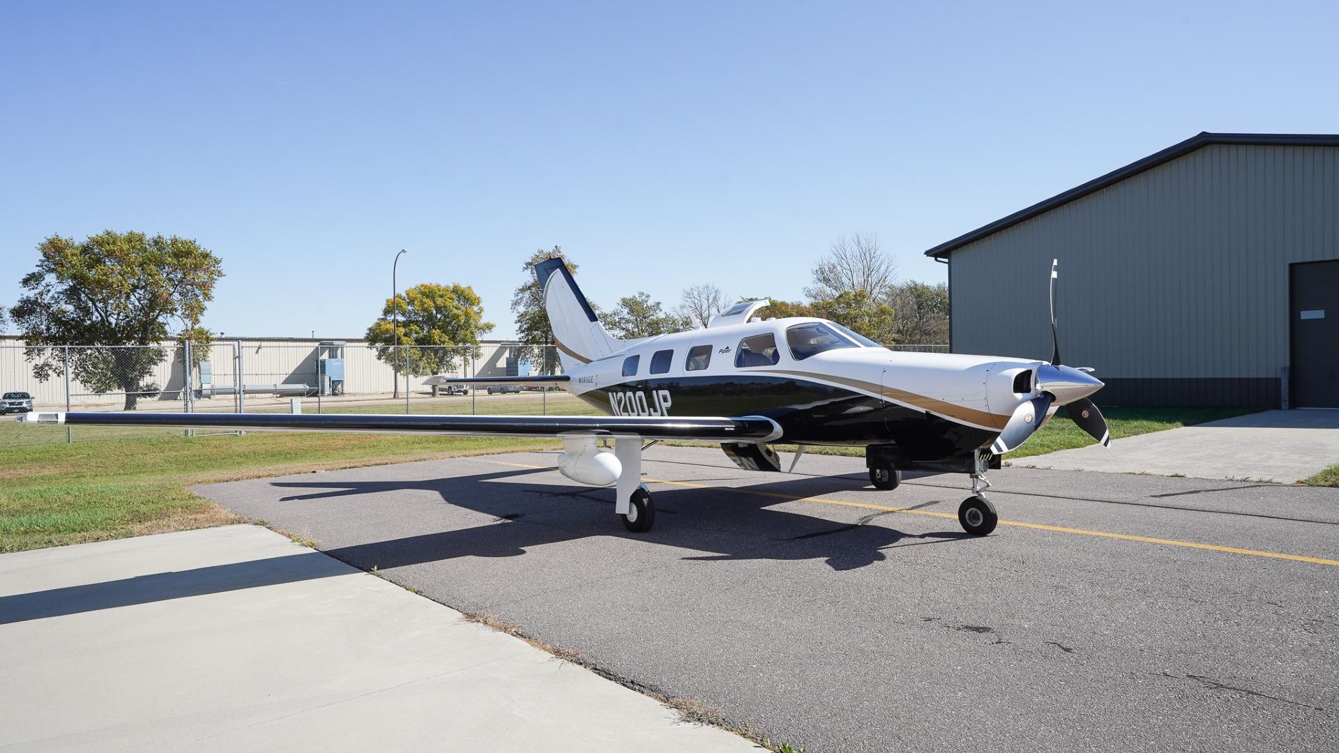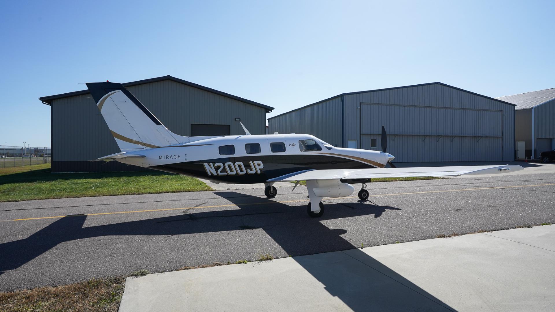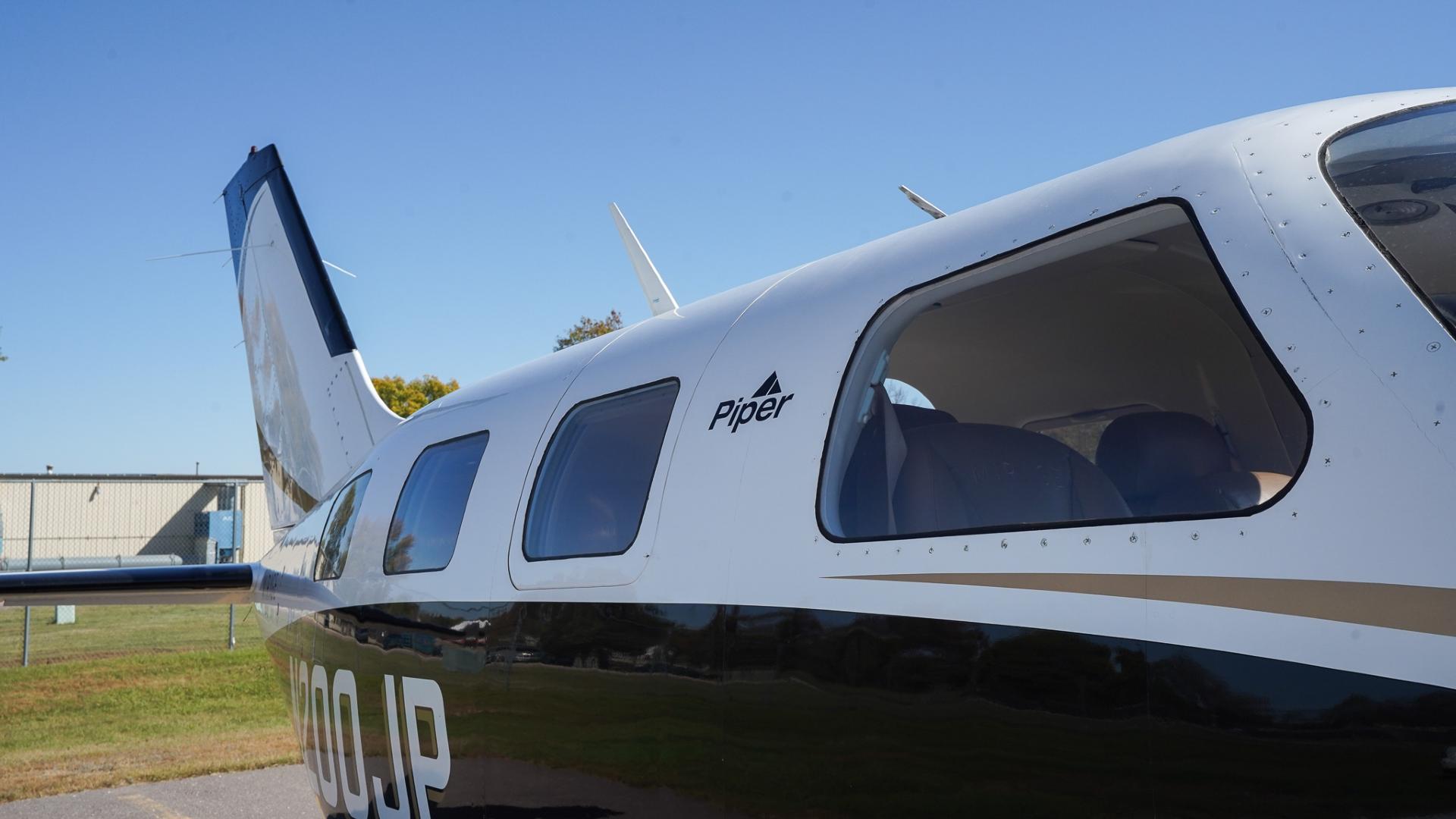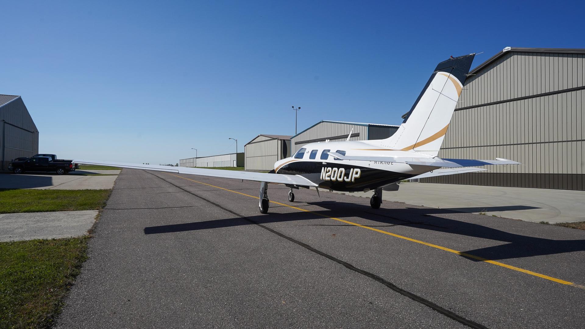 This Piper Malibu Mirage features a timeless and elegant paint scheme: a crisp overall white top paired with a sleek black lower fuselage, accented beautifully with subtle gold striping. The combination gives the aircraft a refined yet commanding ramp presence that turns heads wherever it goes.