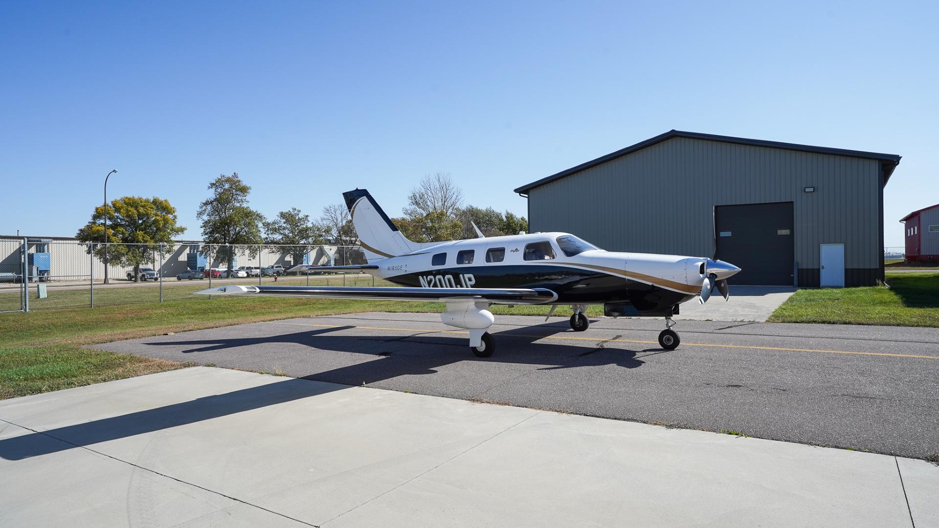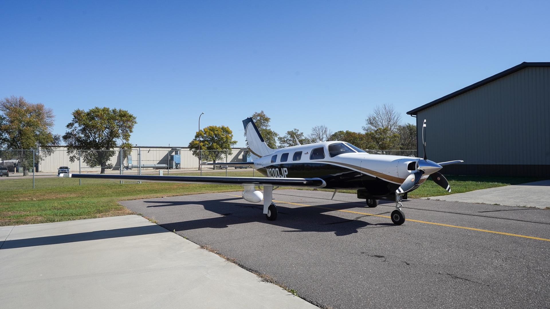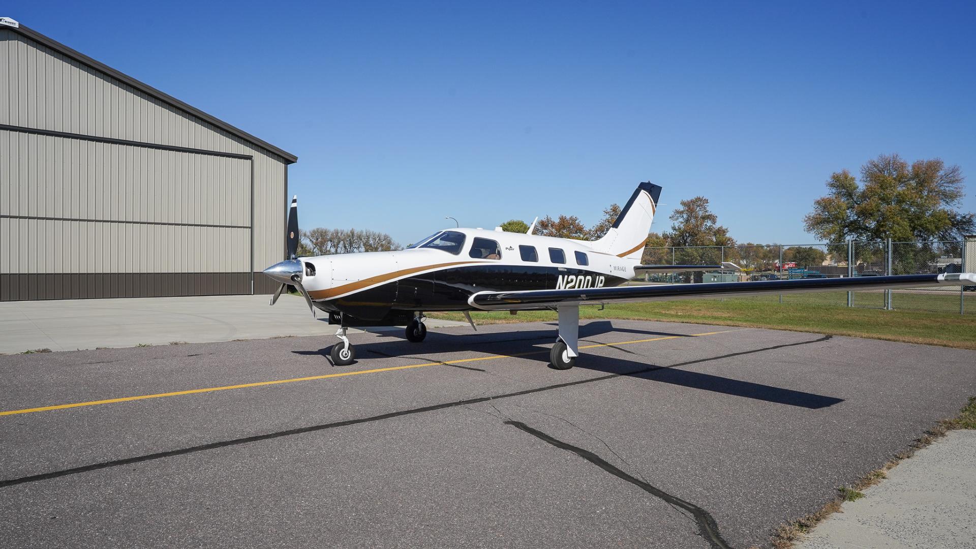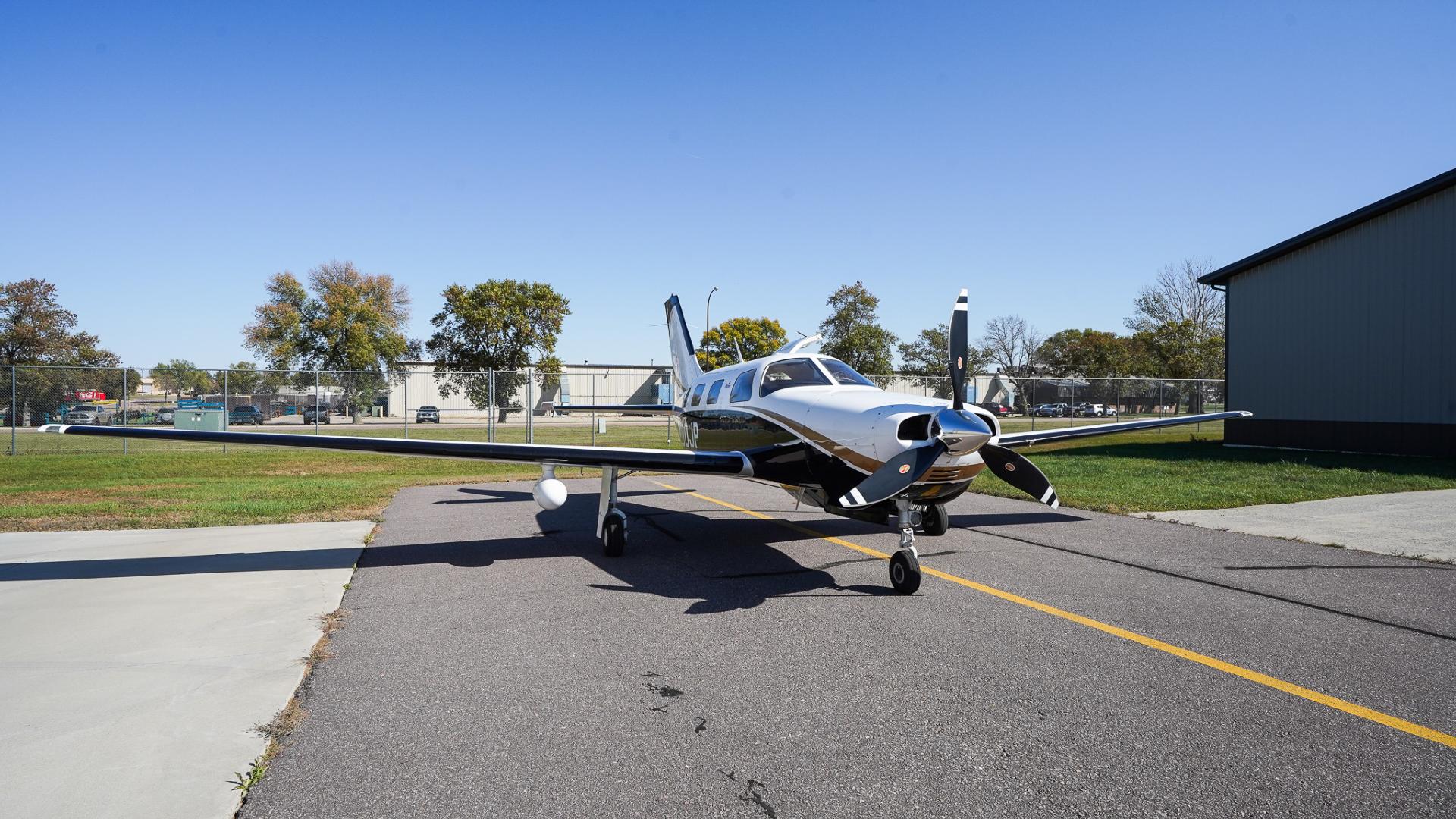 This Piper Malibu Mirage features a timeless and elegant paint scheme: a crisp overall white top paired with a sleek black lower fuselage, accented beautifully with subtle gold striping. The combination gives the aircraft a refined yet commanding ramp presence that turns heads wherever it goes.