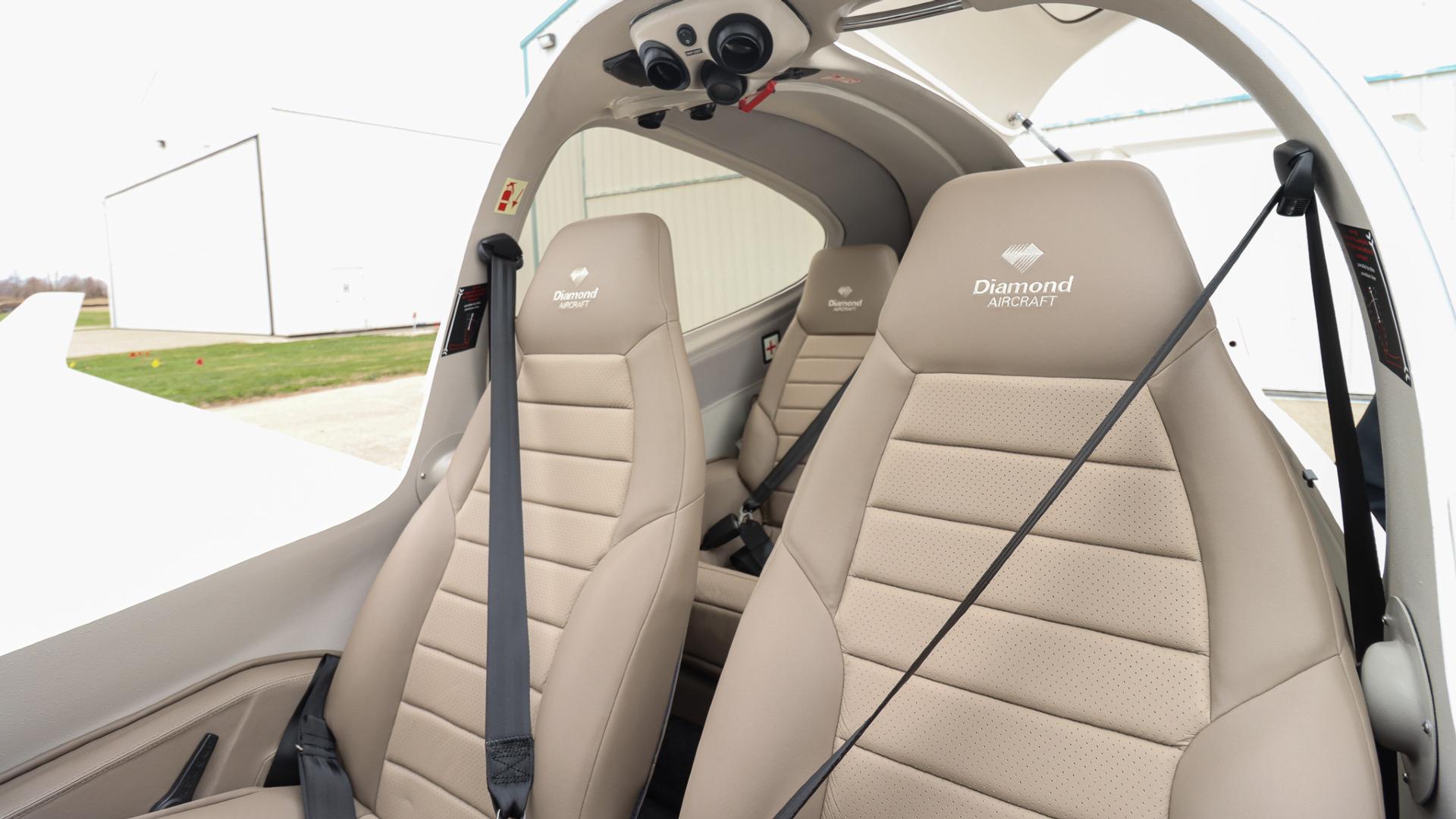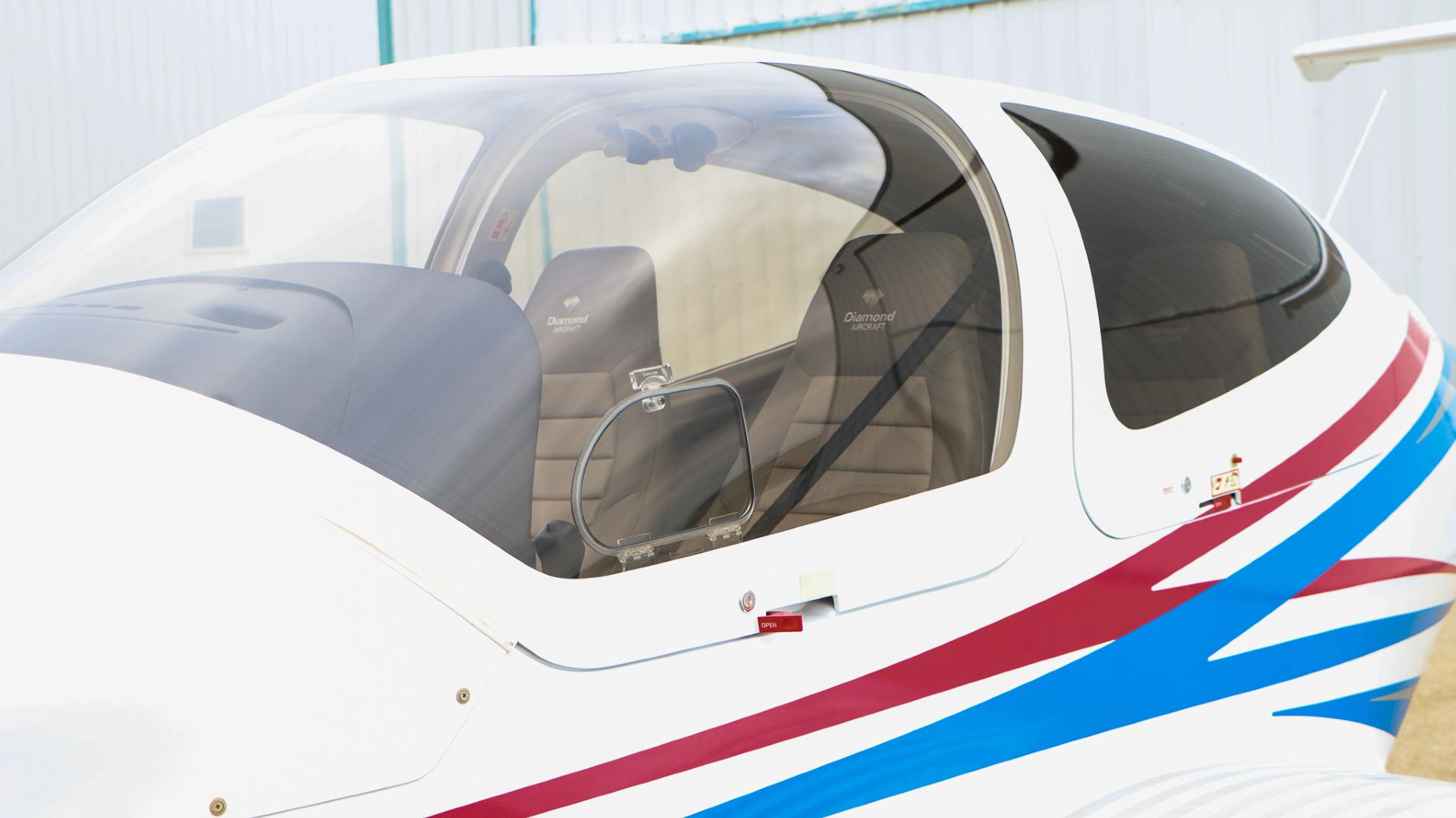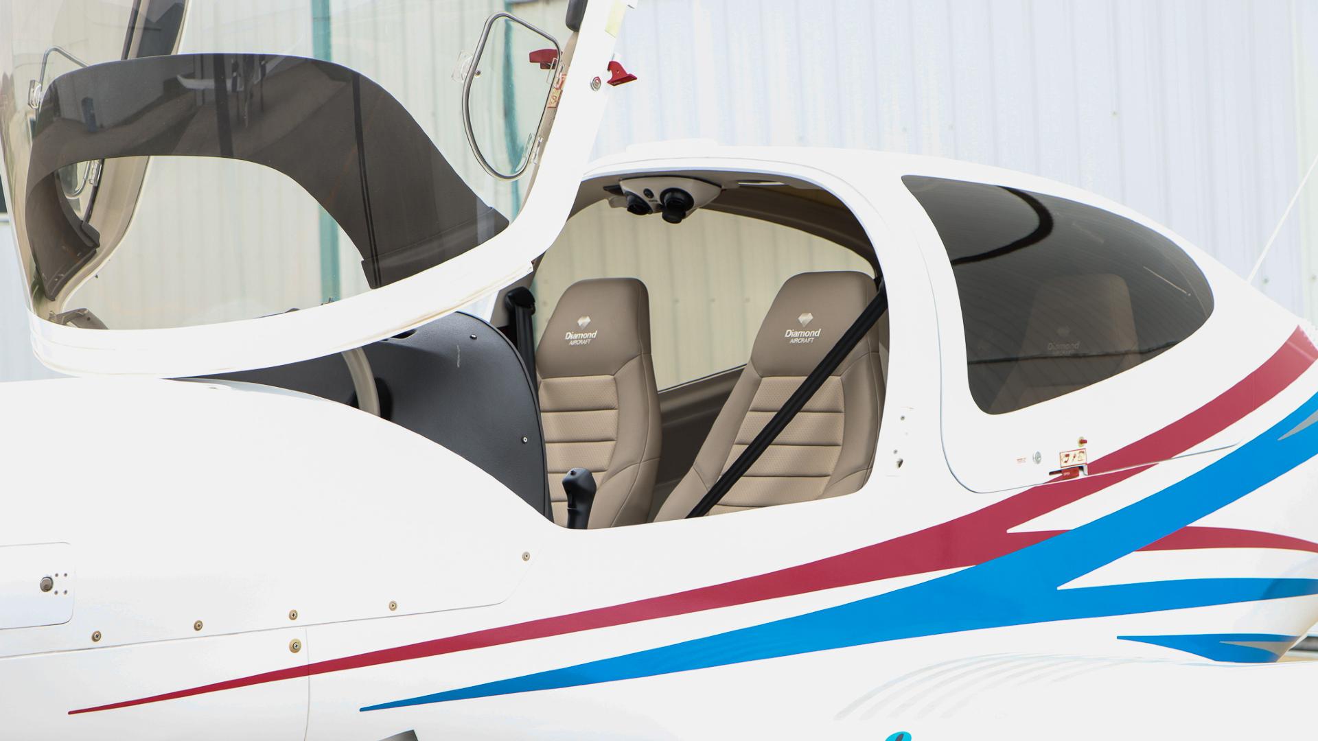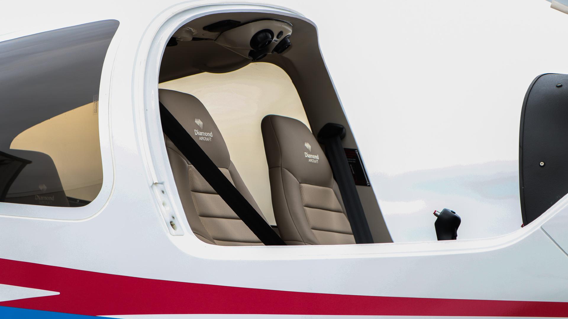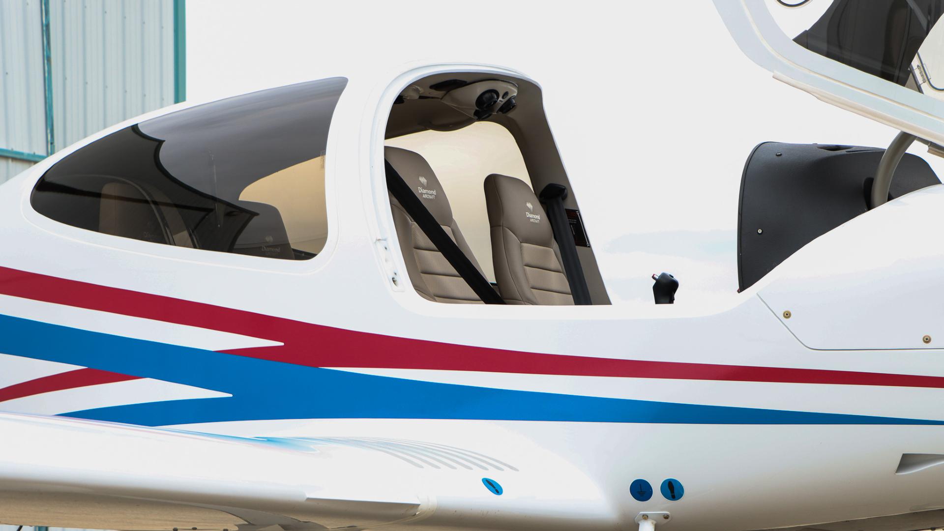 Finished in a crisp white base accented by bold red and blue exterior striping, this aircraft turns heads on the ramp while maintaining Diamond’s signature aerodynamic elegance.