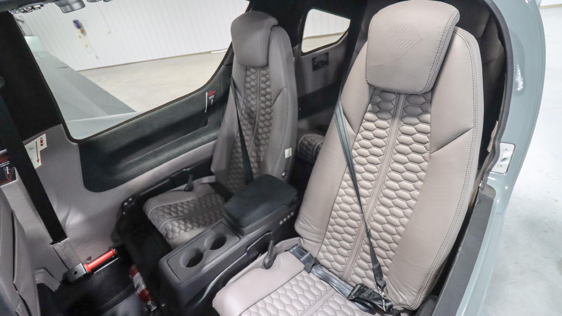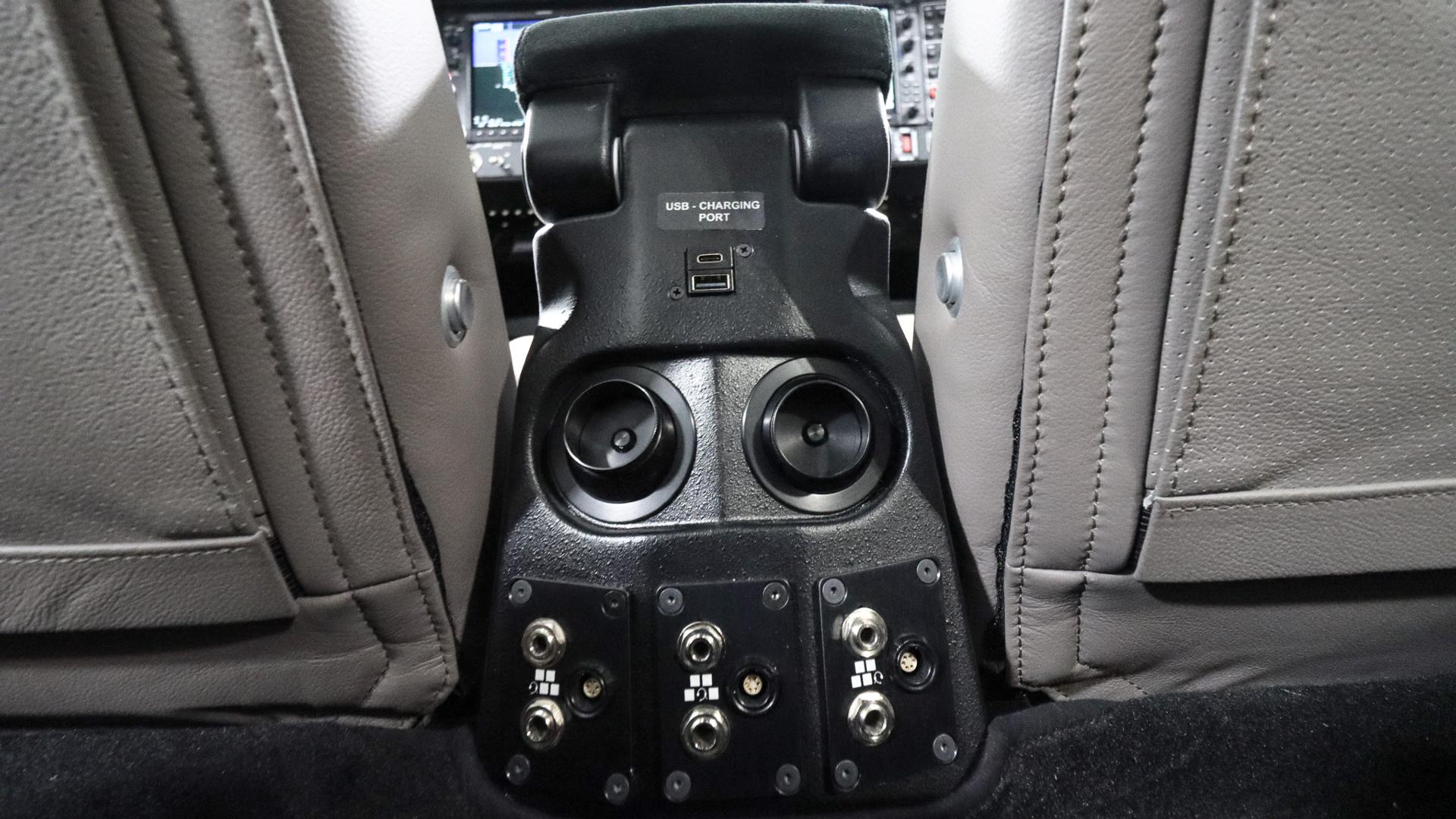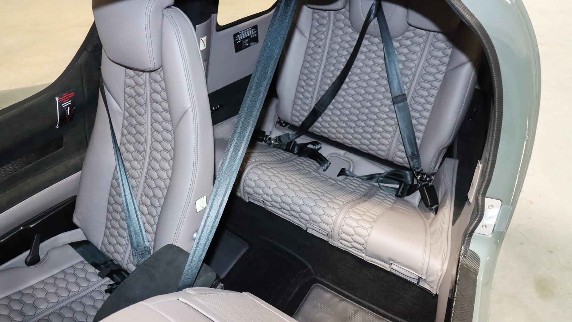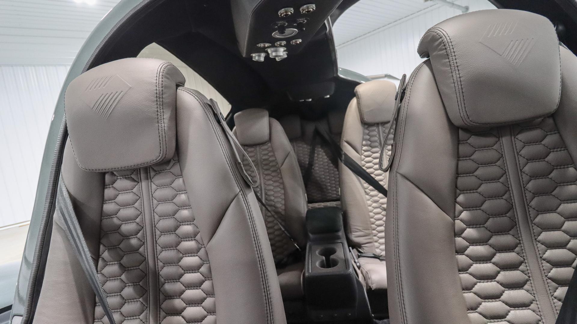 Finished in light gray leather with a distinctive hexagonal pattern, the cabin strikes the perfect balance between modern luxury and European design. The upgraded seating is exceptionally comfortable, with the second row fully reclining and thoughtfully appointed with a center console and cupholders—details that make every flight more enjoyable for passengers and crew alike.