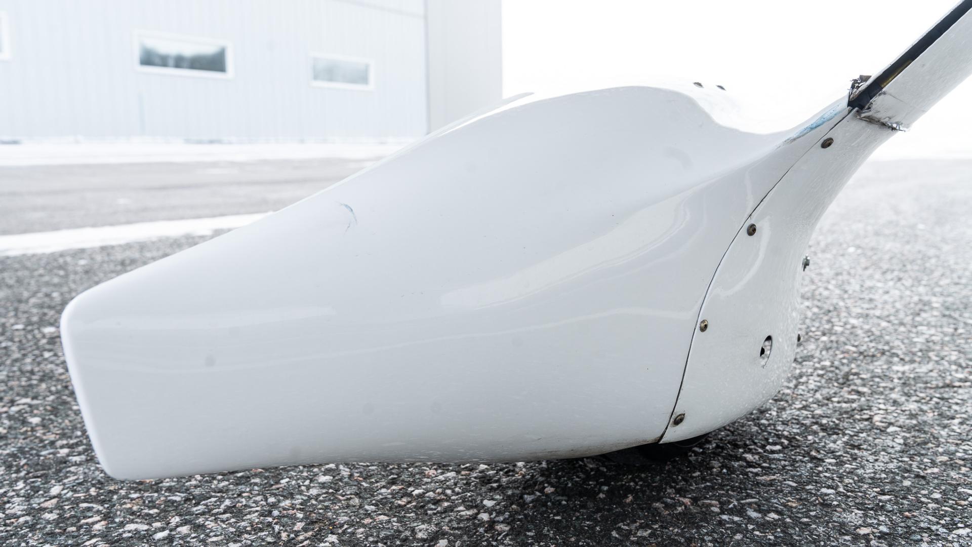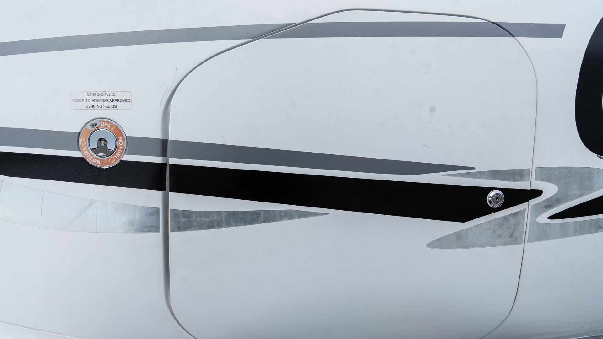 Base white with an elegant black and silver vinyl scheme. The original paint is in excellent condition for the vintage. It has been continuously hangar stored and shows nicely.