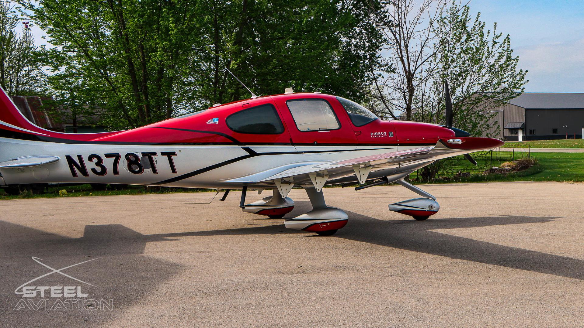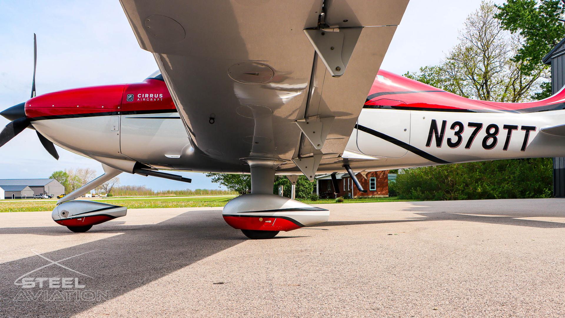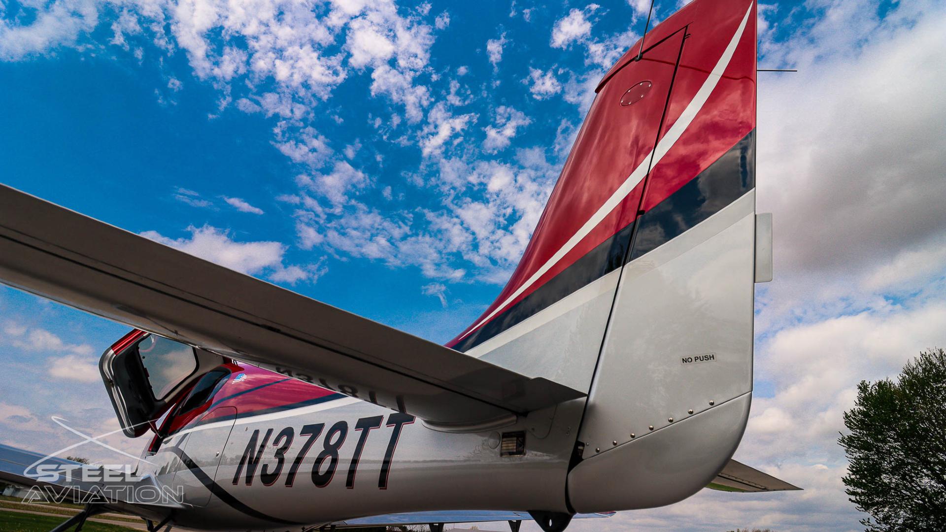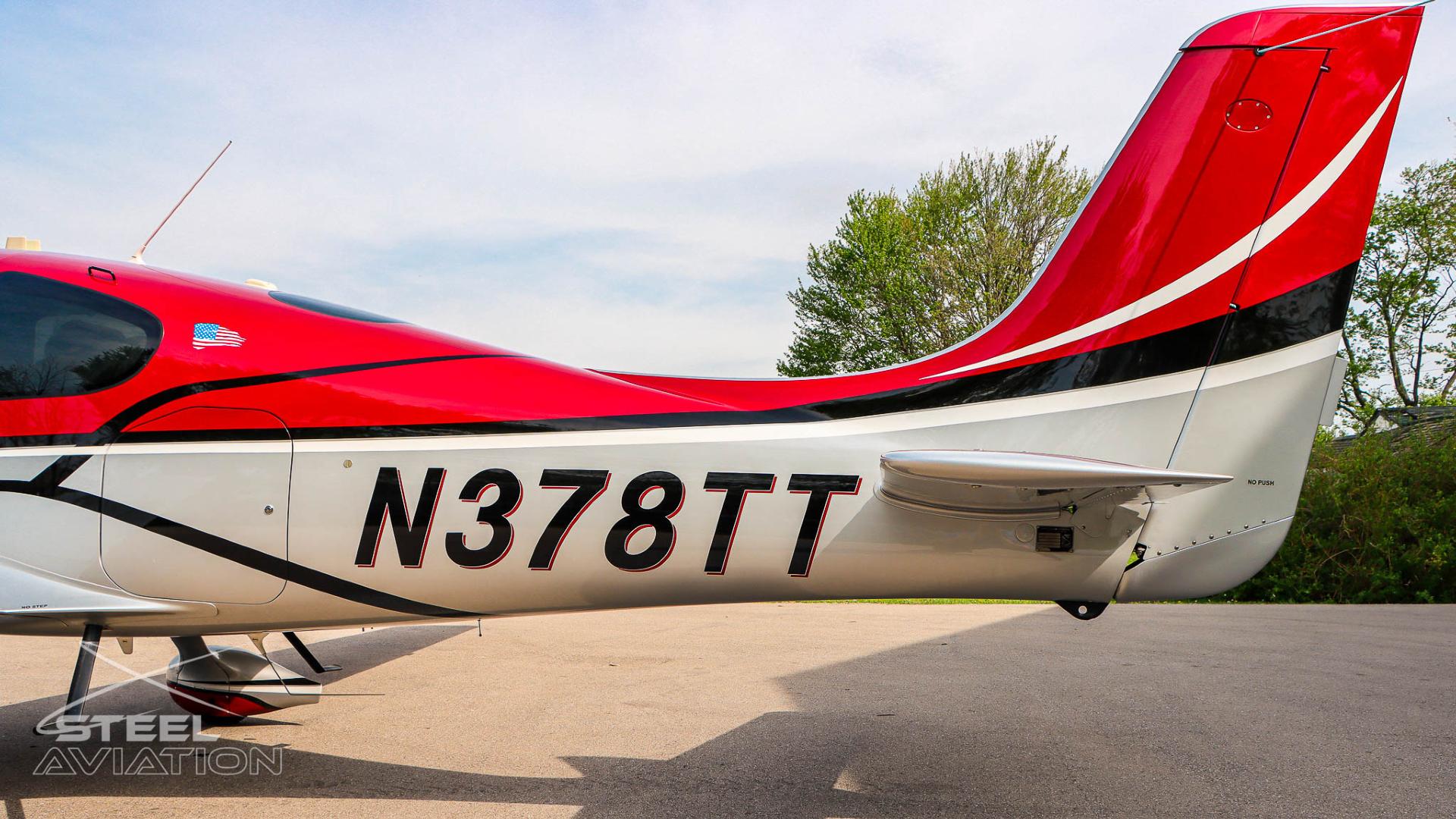 Draped in a striking red-and-silver custom scheme that looks fast even standing still, N378TT carries itself with a quiet confidence. The lines are clean, purposeful, almost predatory—like it knows exactly what it was built to do. Slide closer and you start to notice the details: the sculpted wheel fairings, the smooth composite curves, the way the paint catches light like polished metal at speed.