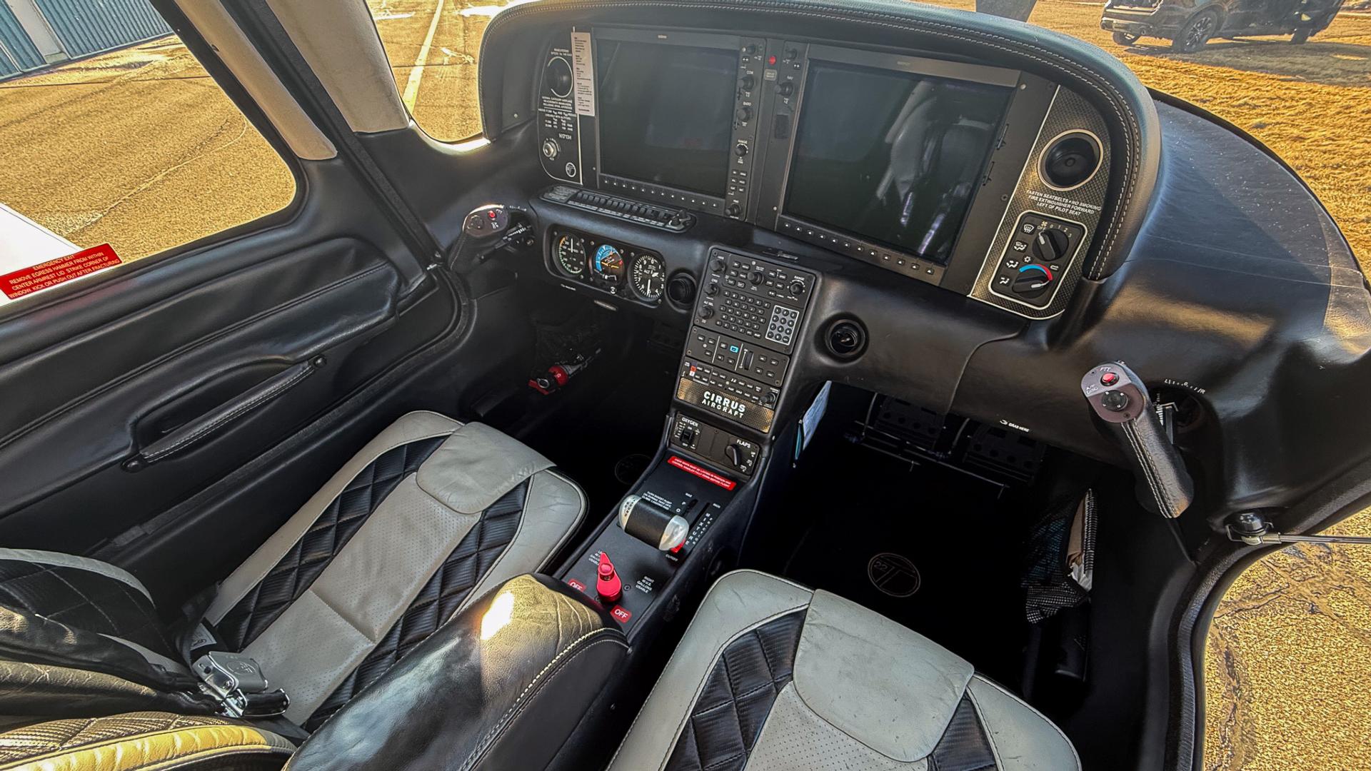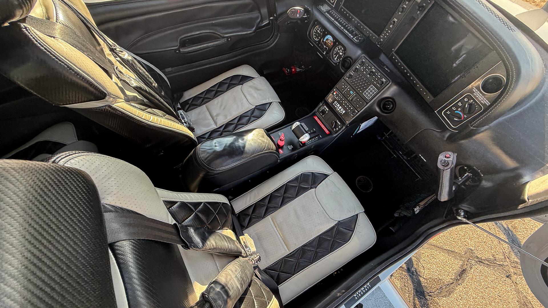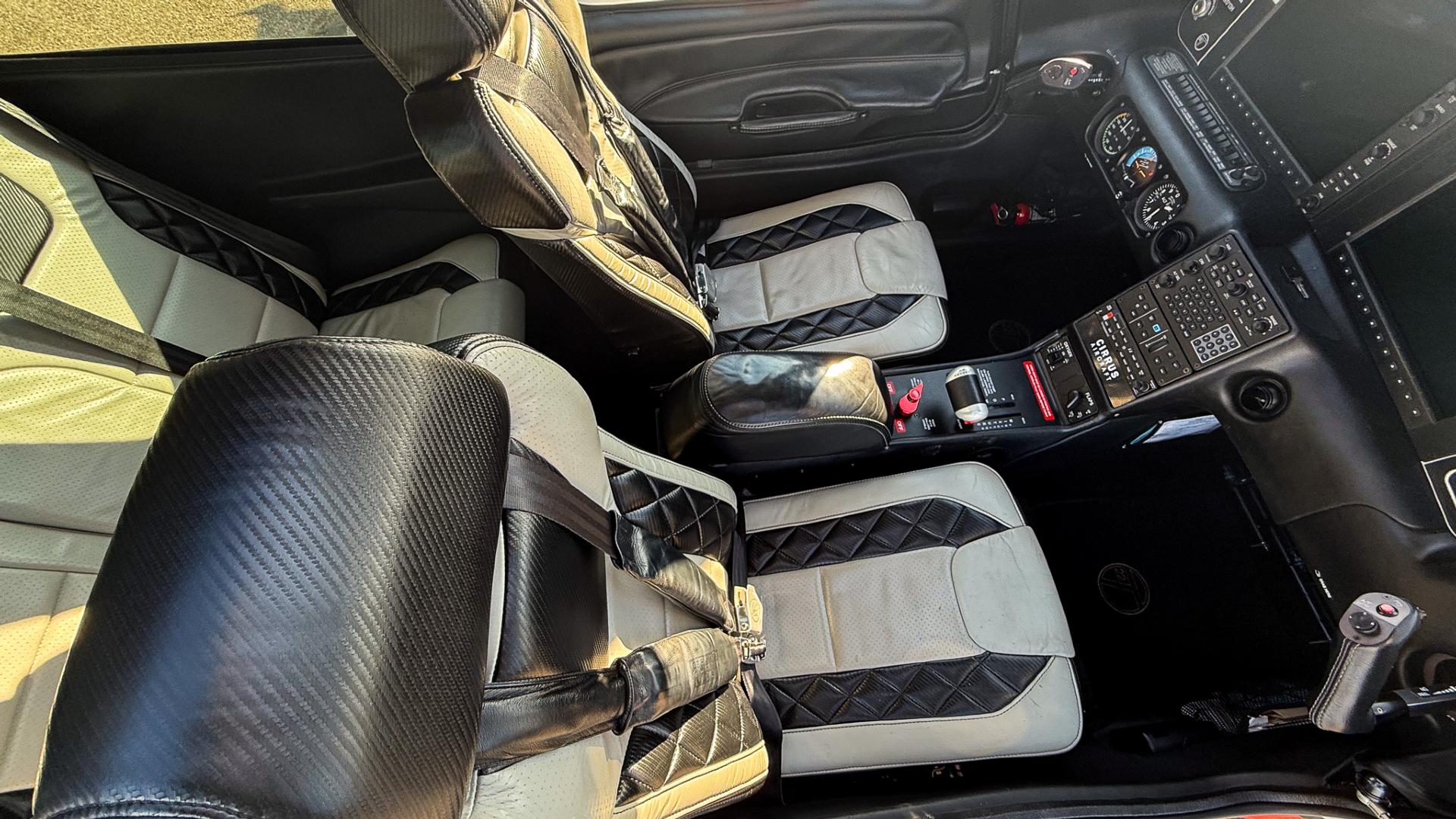 The cabin features an eye-catching Carbon-inspired leather interior that blends modern styling with everyday comfort. Two-tone seating combines white leather centers with bold black diamond-stitched inserts and carbon-look accents, creating a refined yet sporty atmosphere throughout the cockpit. The seats present nicely with excellent structure and finish, reflecting consistent care and pride of ownership. Complemented by matching side panels and a clean, well-kept center console, this interior delivers a premium feel that passengers will immediately appreciate while maintaining the durability expected of a serious traveling aircraft.