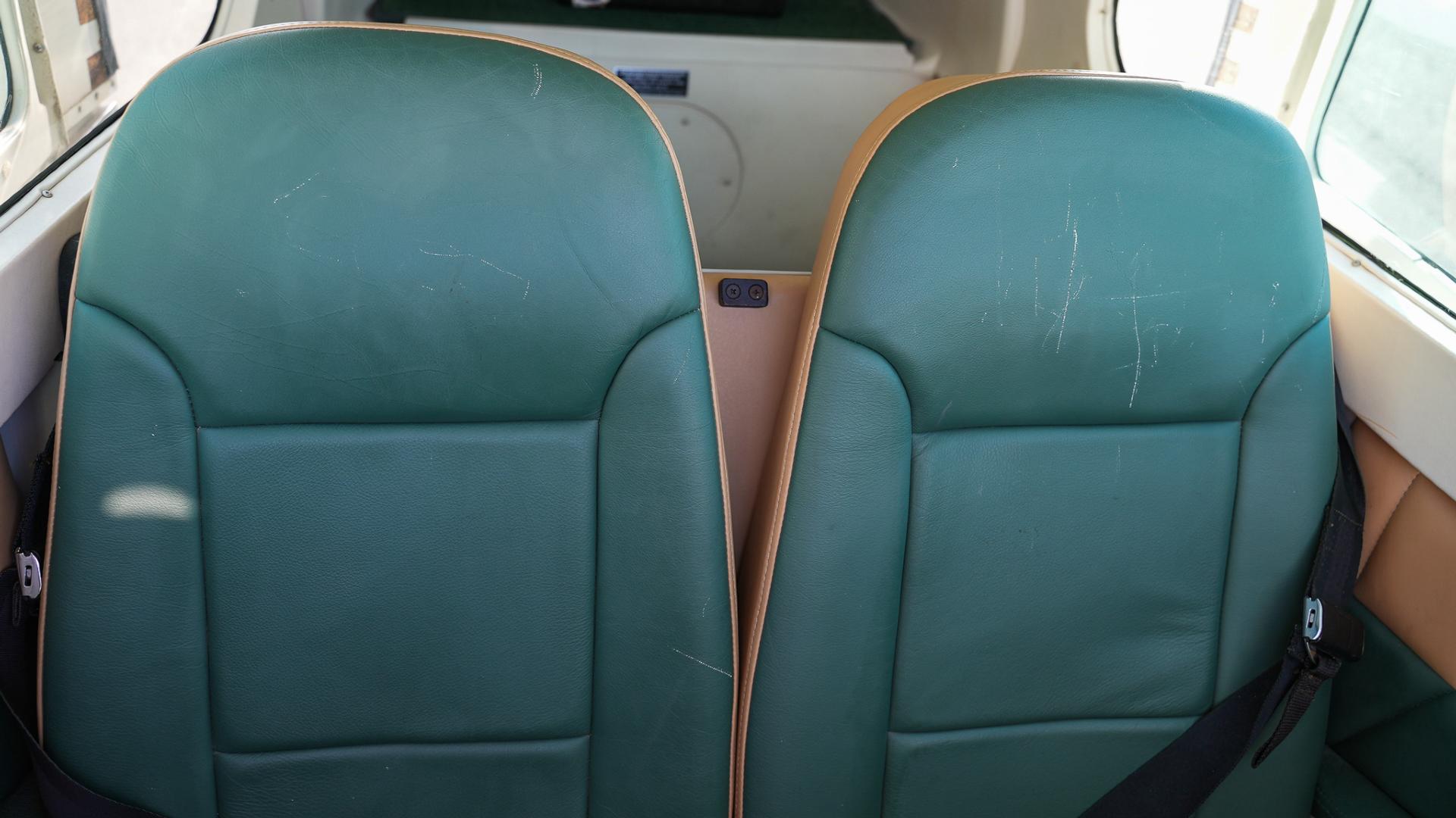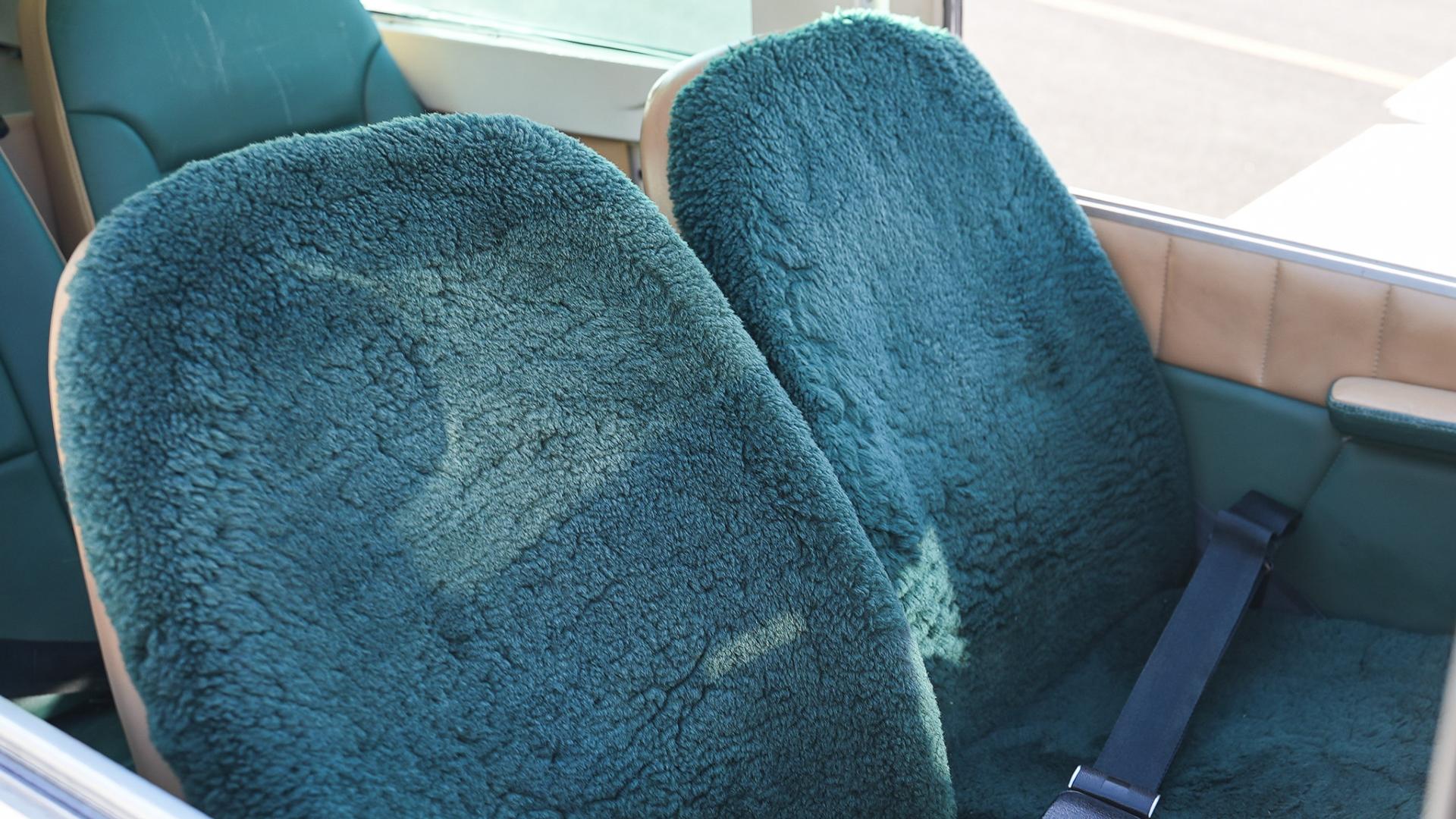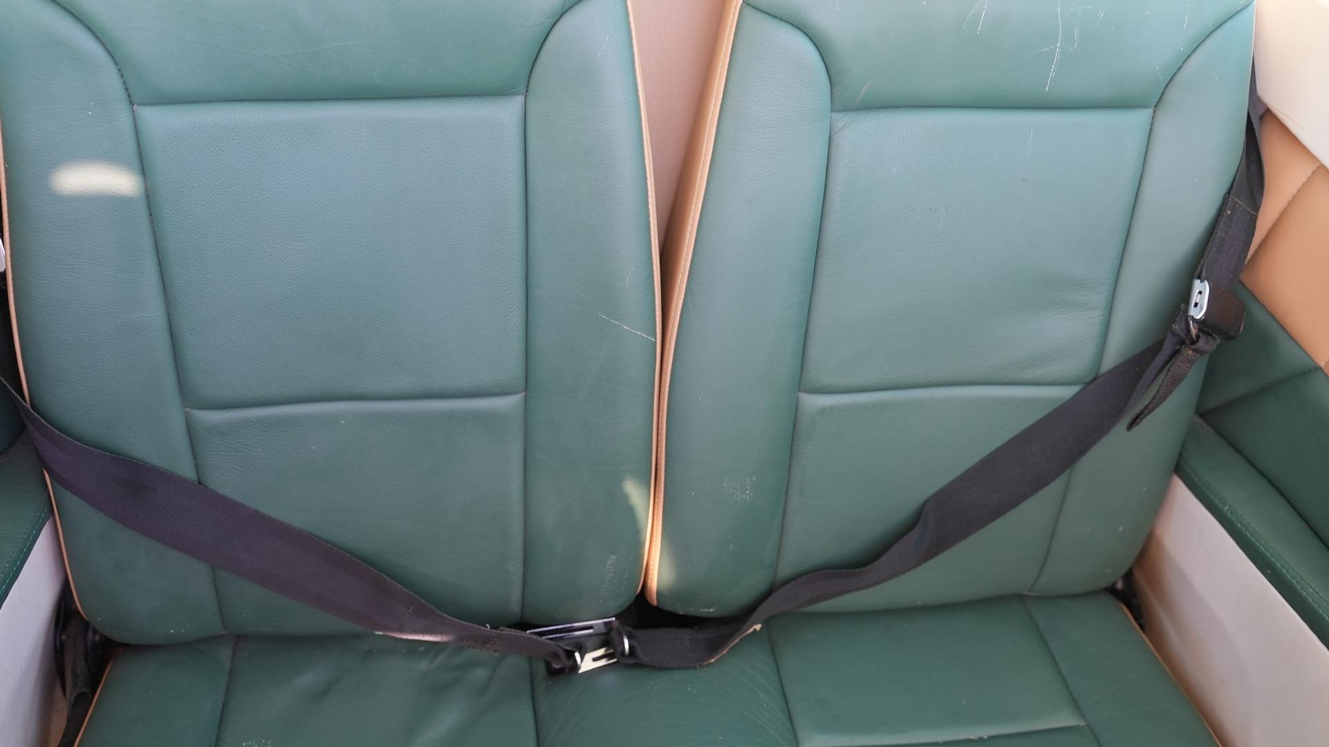 Green and tan leather interior with green sheepskin (pilot seats), green carpet, and matching tan and green leather trim paneling. The interior is in overall good condition with some minor scratches on rear passenger seats. 7 / 10