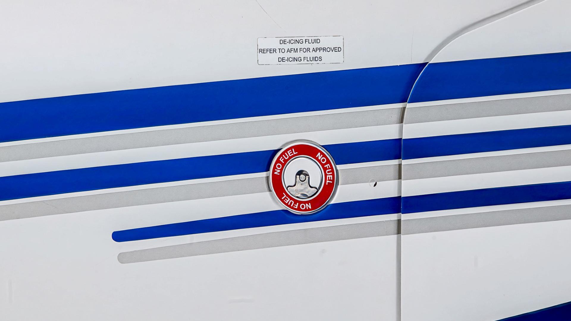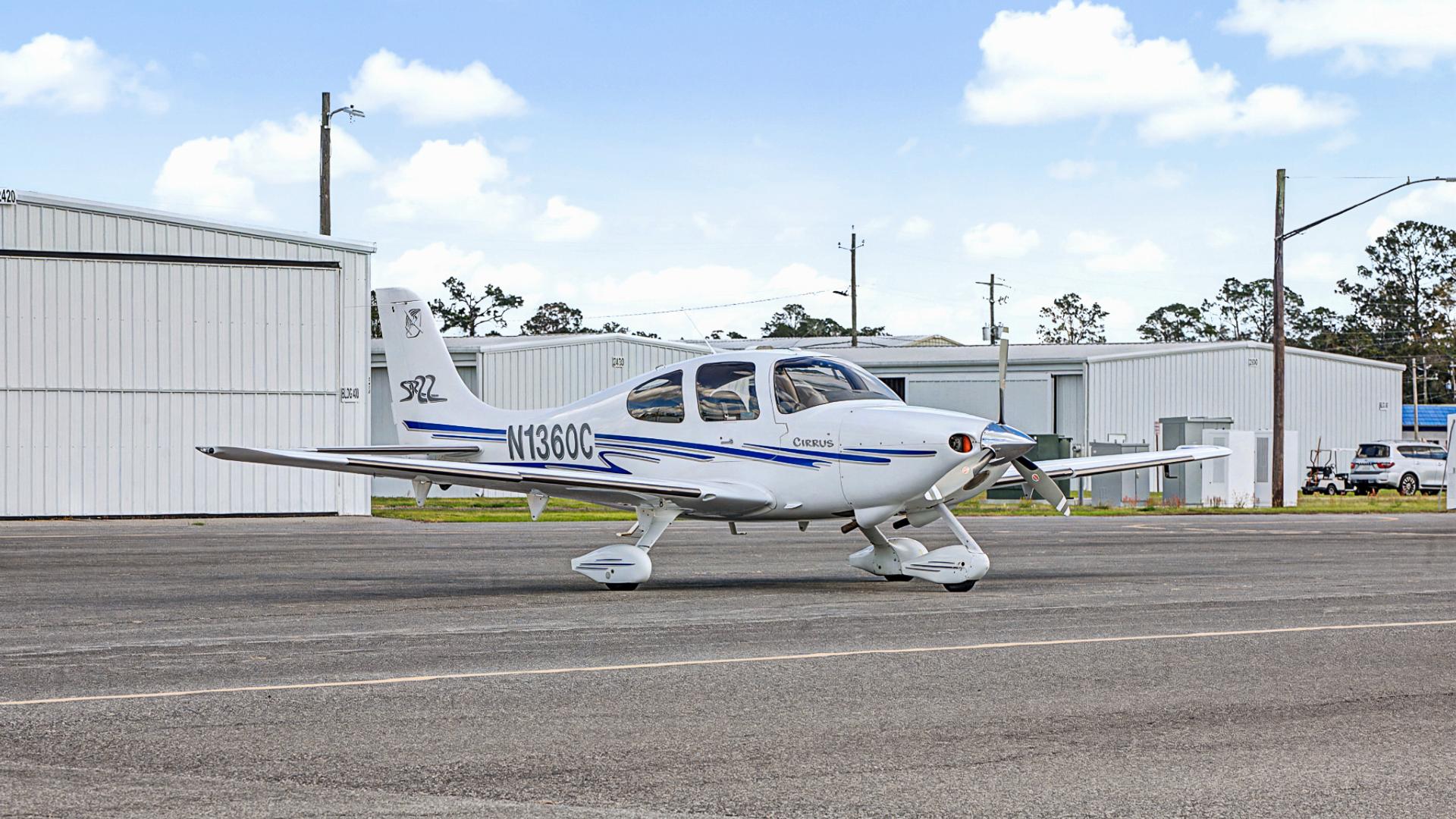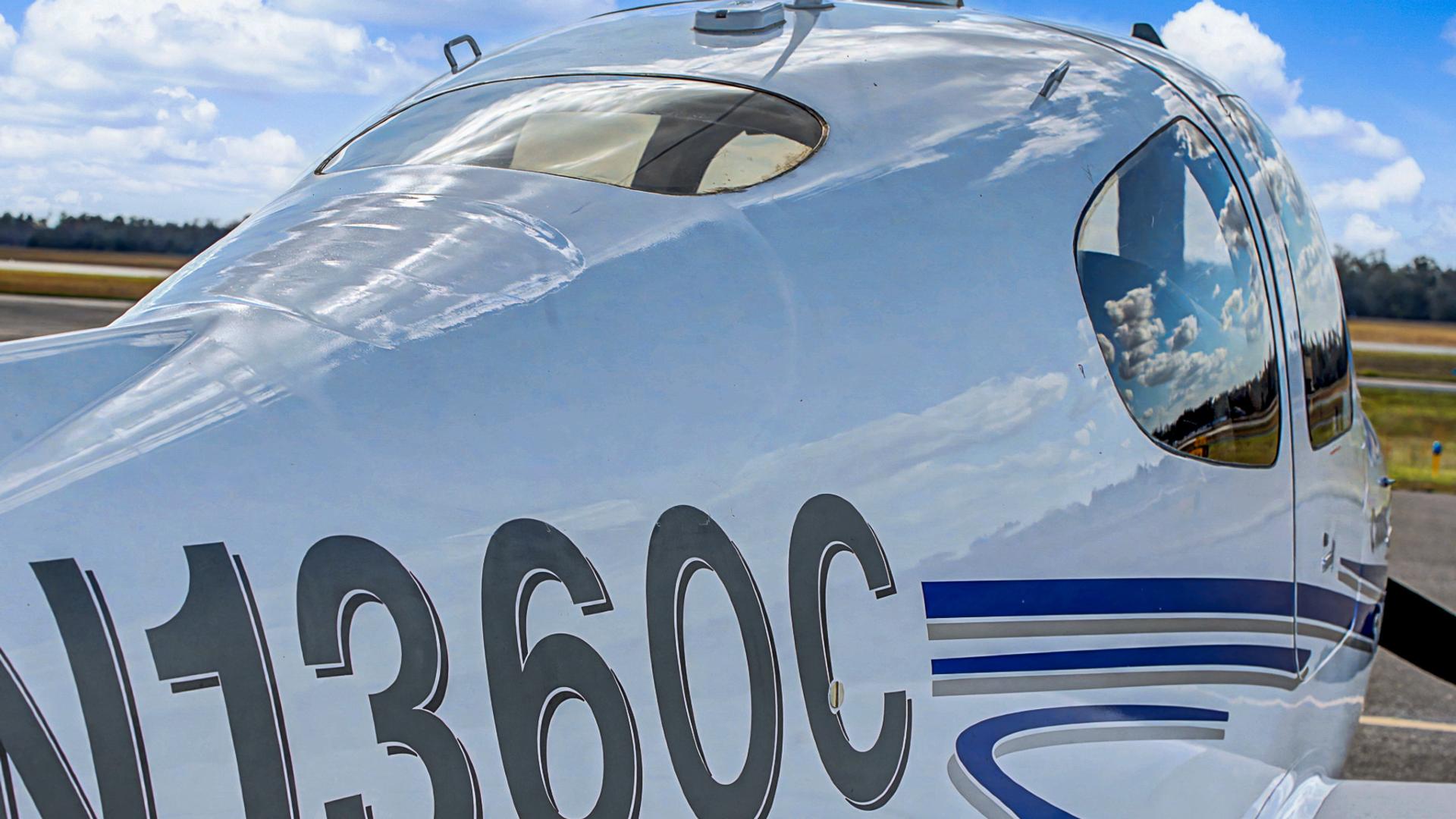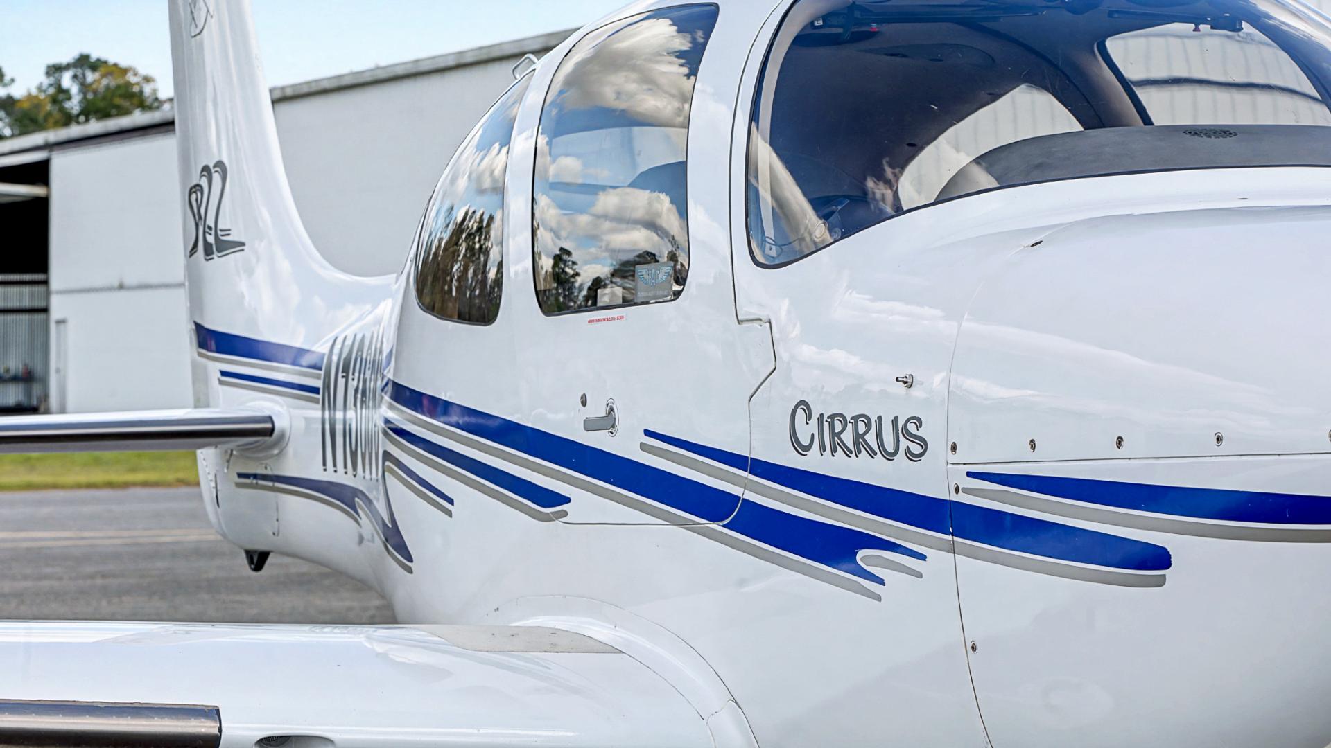 Externally, the aircraft carries a classic white scheme with blue accent striping that still shows the sleek lines the SR22 is known for. While the paint and exterior cosmetics would benefit from some refreshing, the airframe presents well overall and would respond nicely to a cosmetic update.