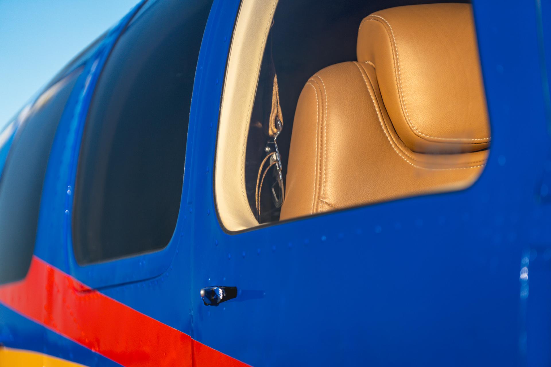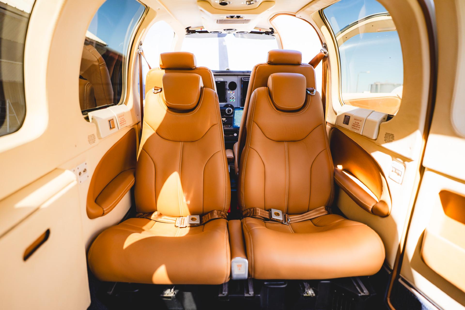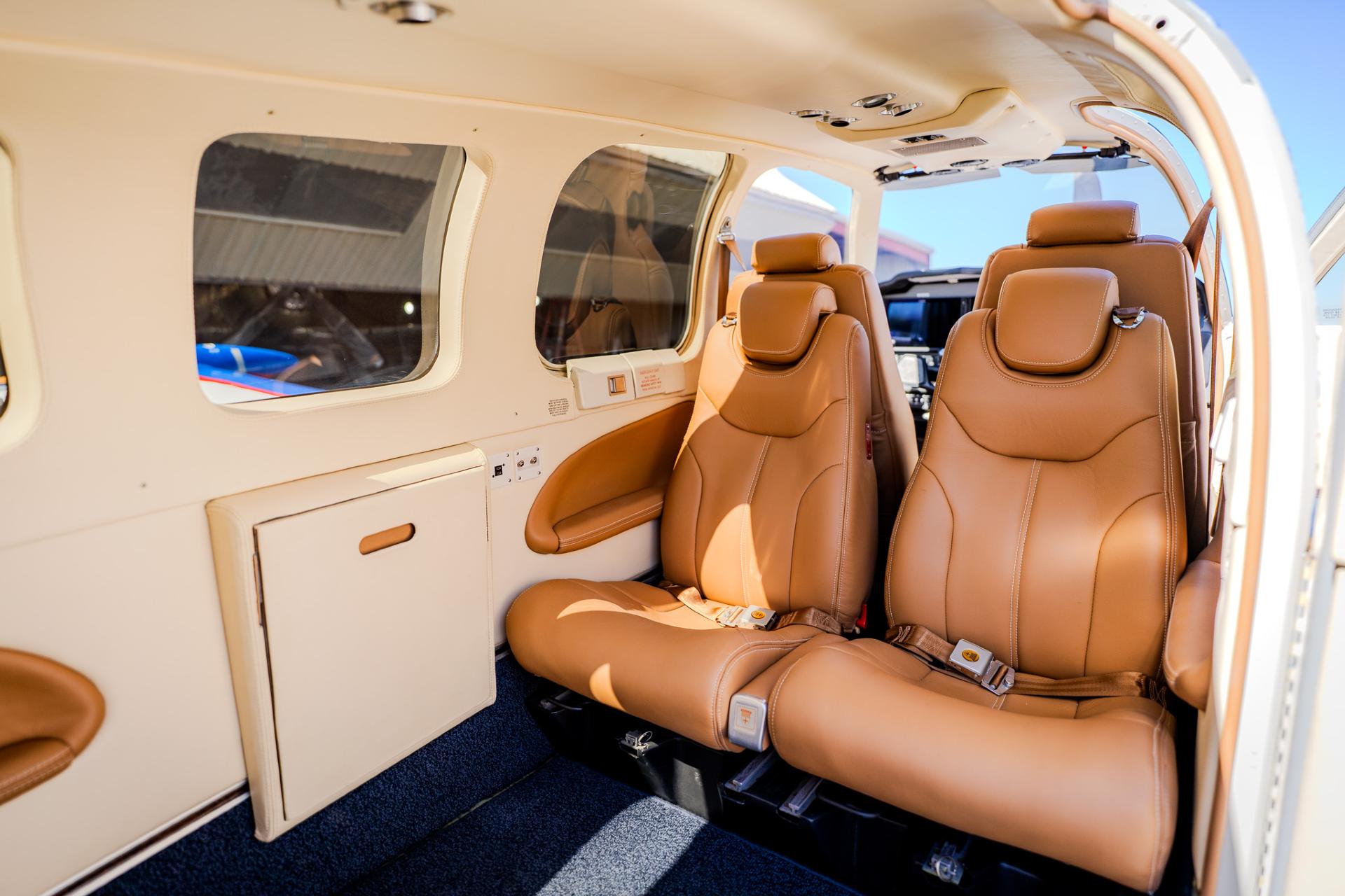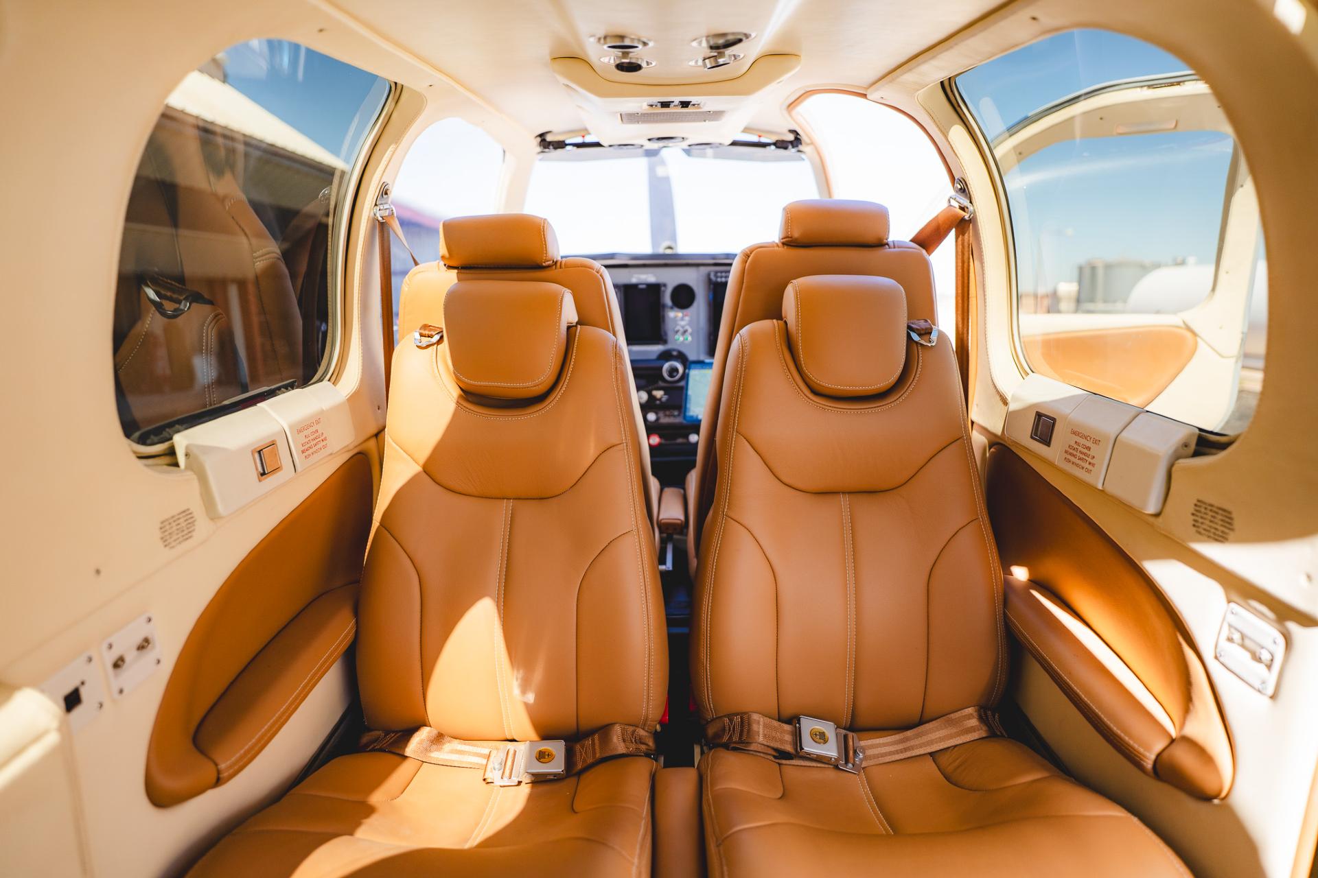 Interior Installed August 2024. This luxurious interior was creatively pieced together by Tim Hallock's shop at Aviation Design. Seats were reupholstered in Avion Caramel Garrett Leather and paired with matching side panels and window moldings. The beautiful cabin is made complete with new carpeting from SCS interiors, interior sound-proofing from Hoover interiors, new seatbelts and cargo webbing from Aviation Safety Products, new windshields and windows from LP Aero Plastics, new Rosen sun visors, and so much more!