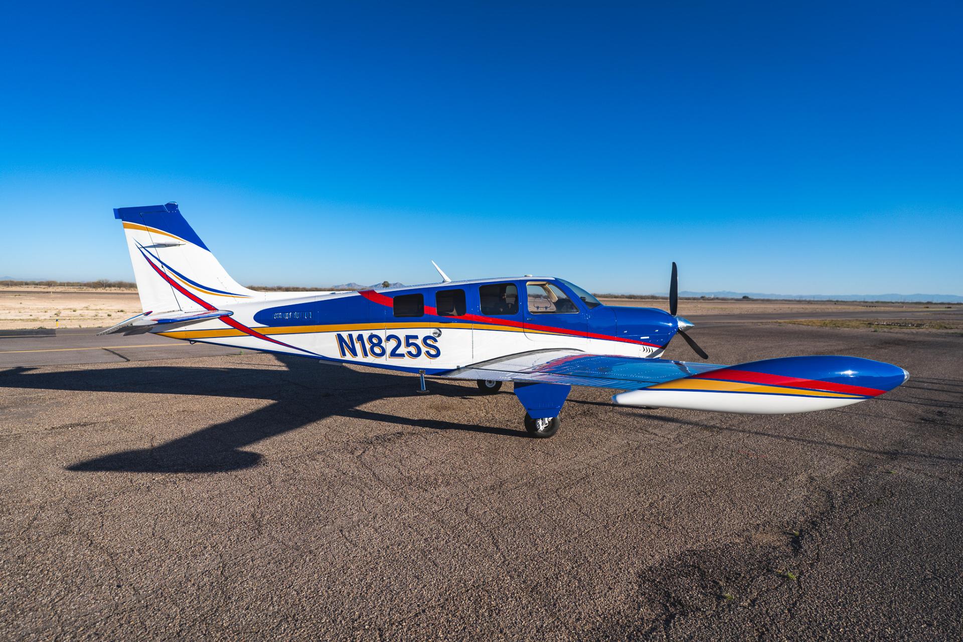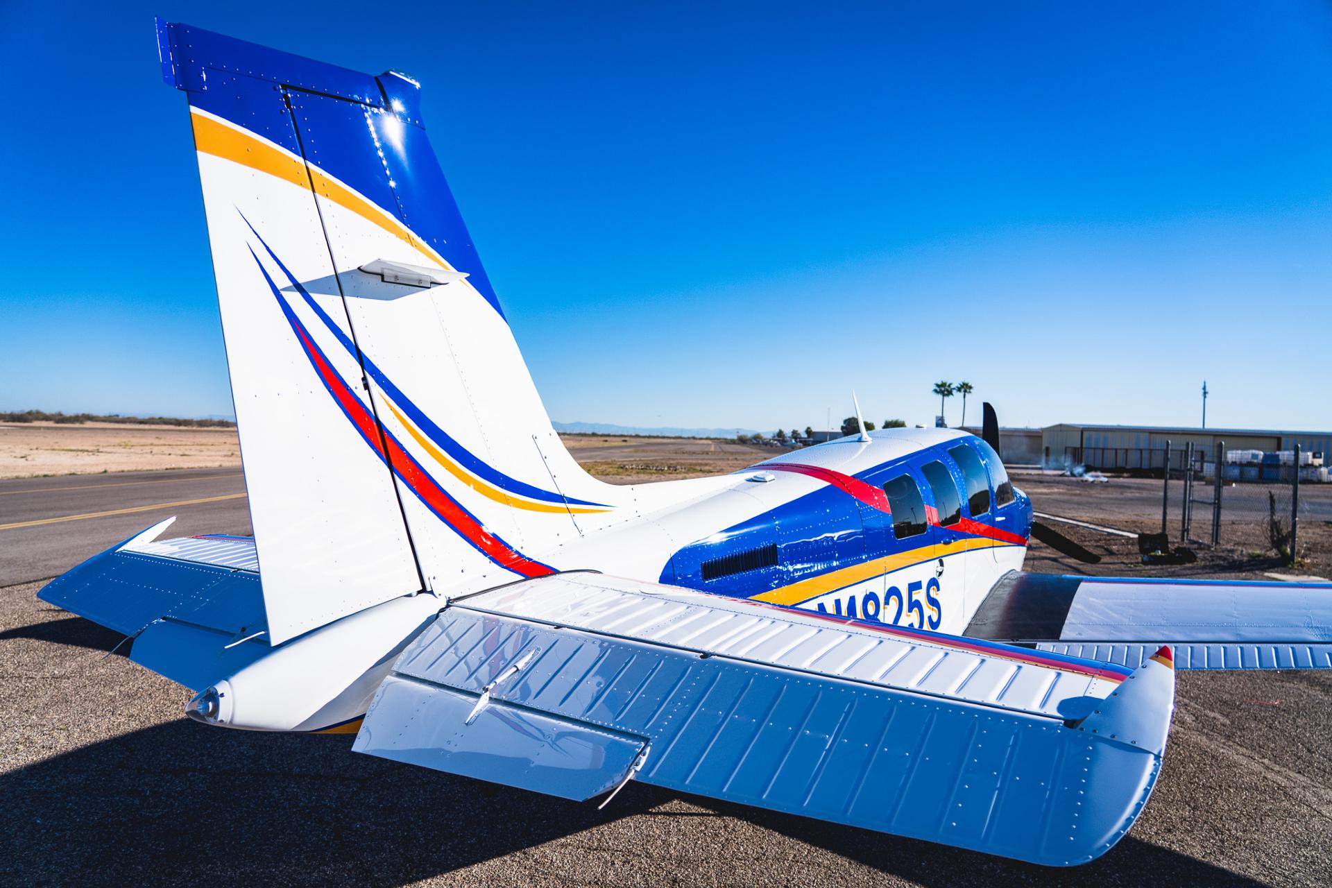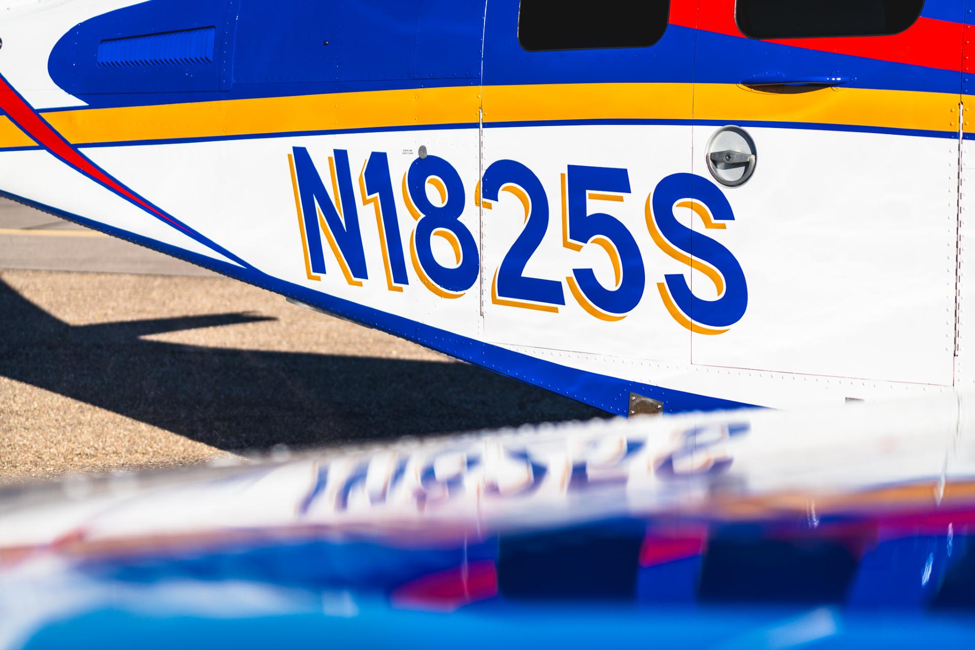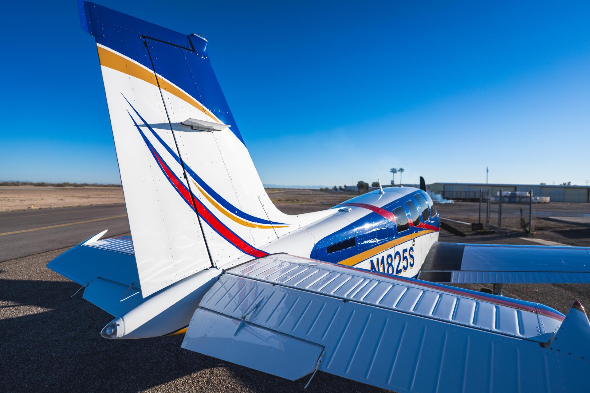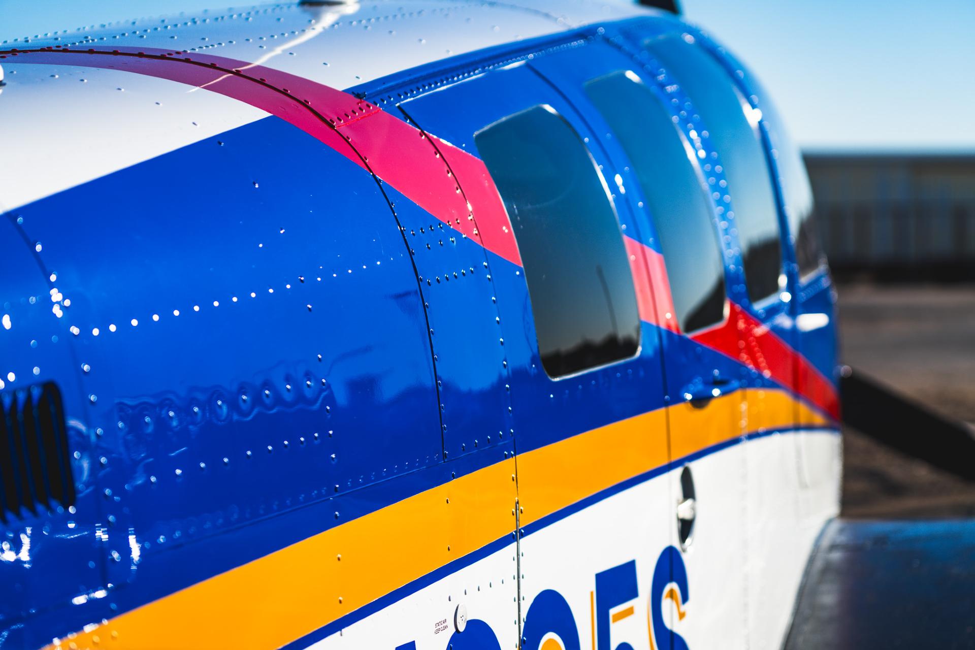 Painted March 2026. Our photographer had to wait for the paint to dry to capture this one! Fresh out of Don Copeland's shop at Arizona Aeropainting, this 4-color work of art from our friends at Scheme Designers is the epitome of eye-catching. All done in layers of high-quality Sherwin Williams paint, watch all the heads turning as you taxi onto the ramp. Colors as follows: JetGlo Matternhorn White with AcryGlo Neptune Blue, Red Pepper, and Mojave Gold trim. Aircraft is hangar-stored in AZ and previously lived in central CA valley - no corrosion!