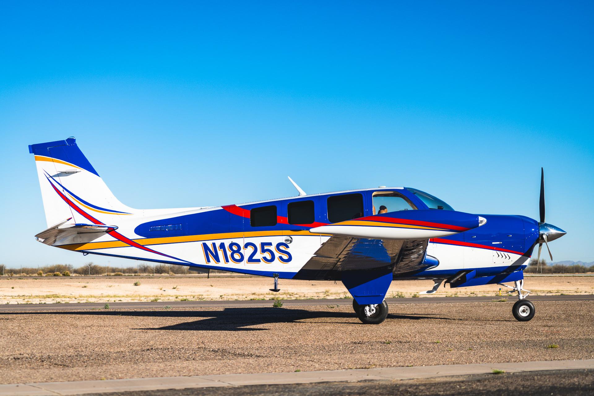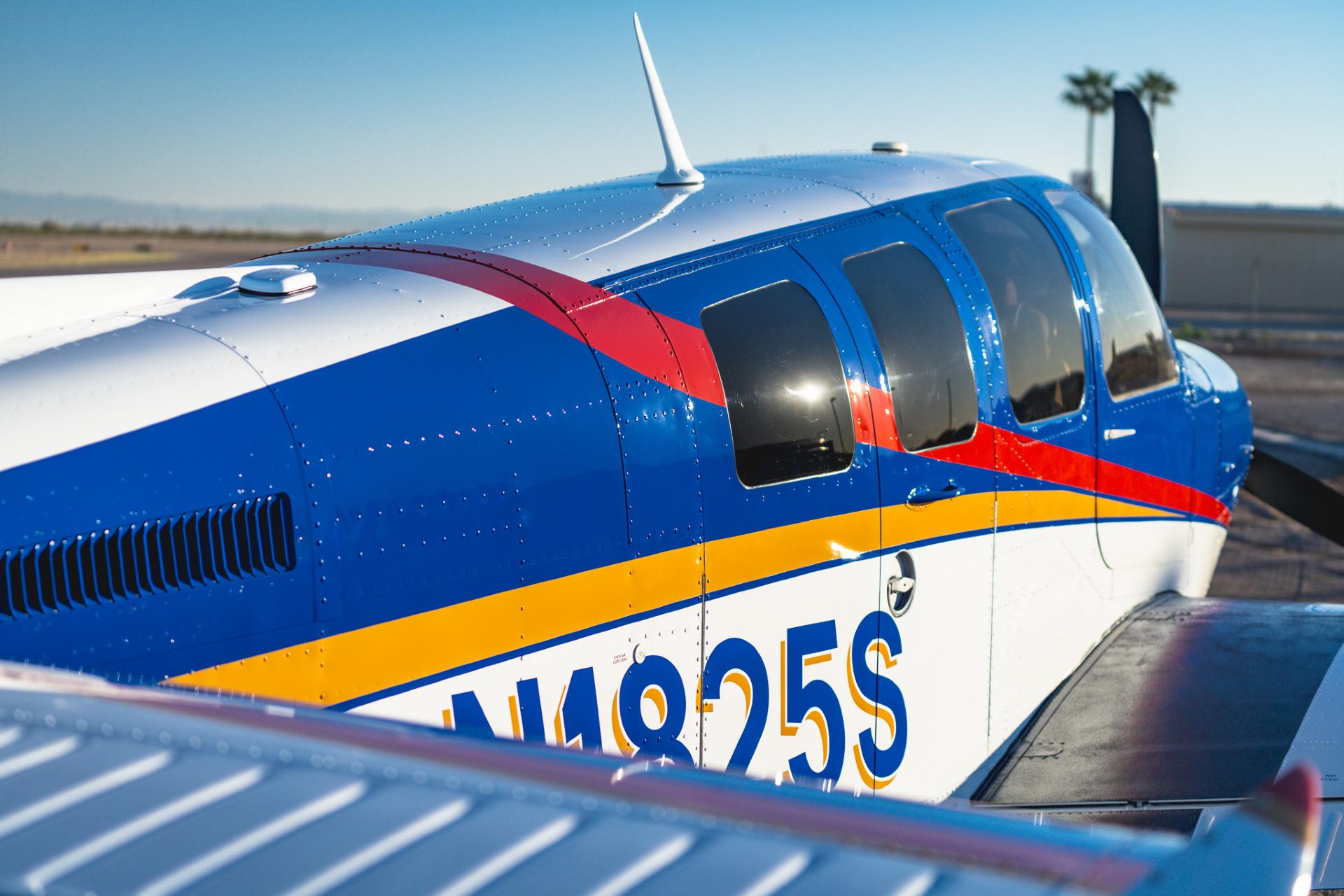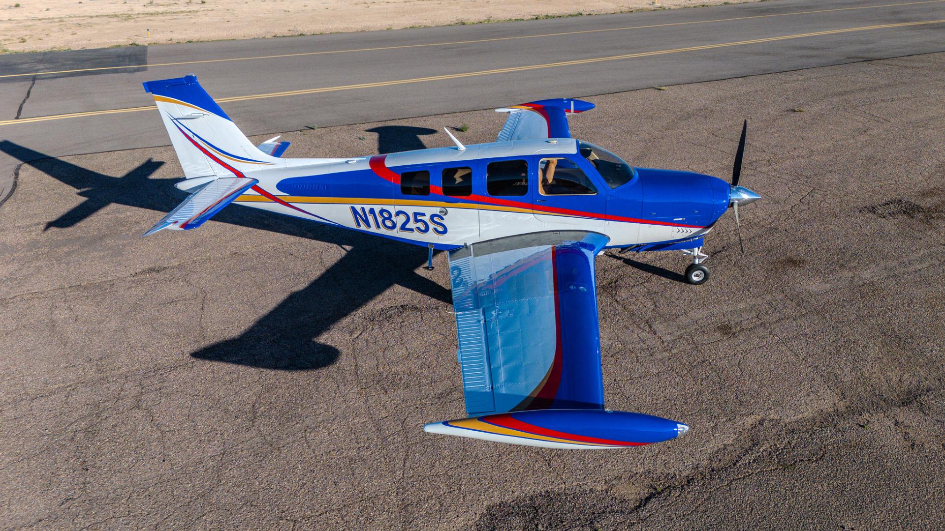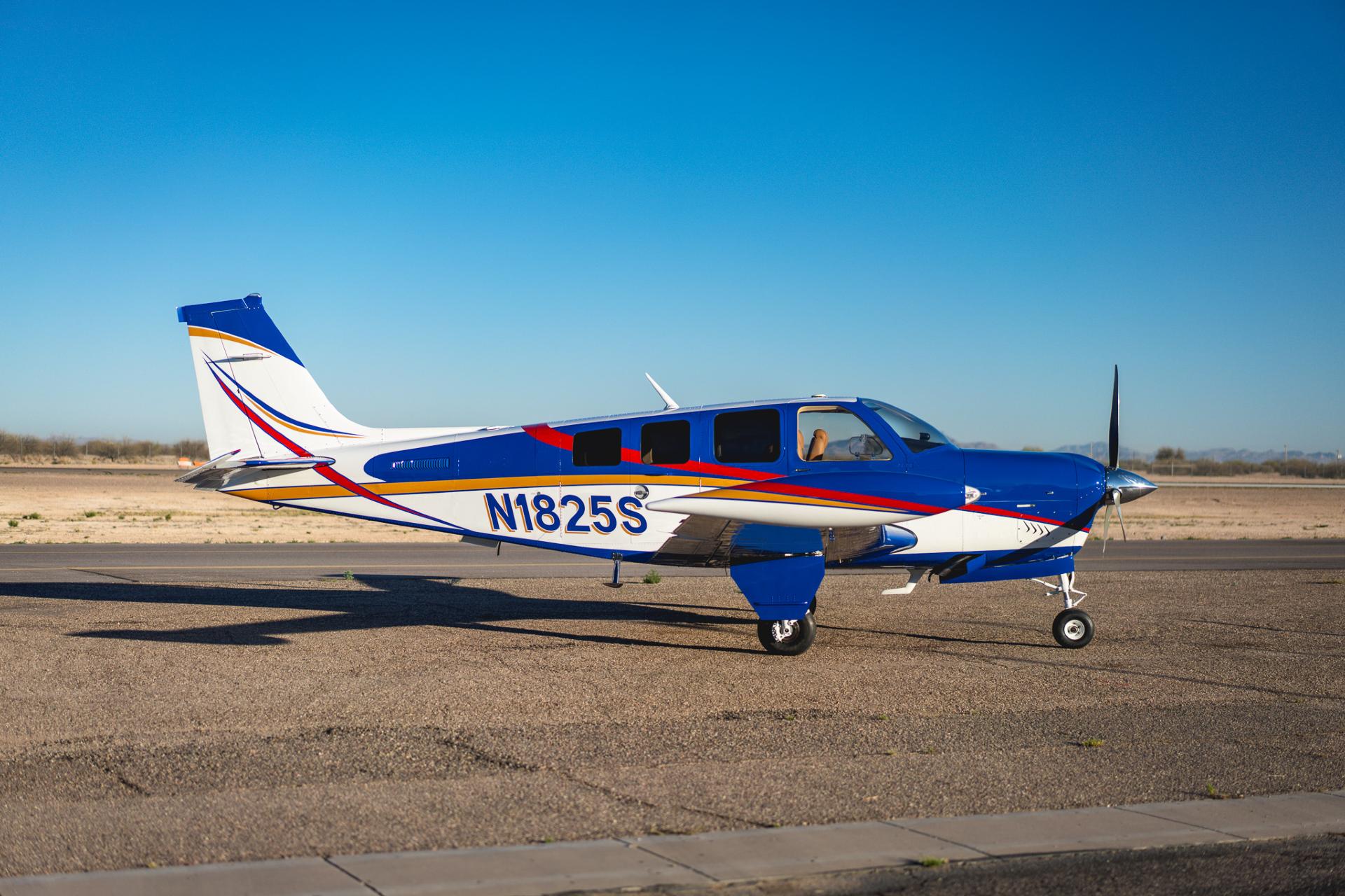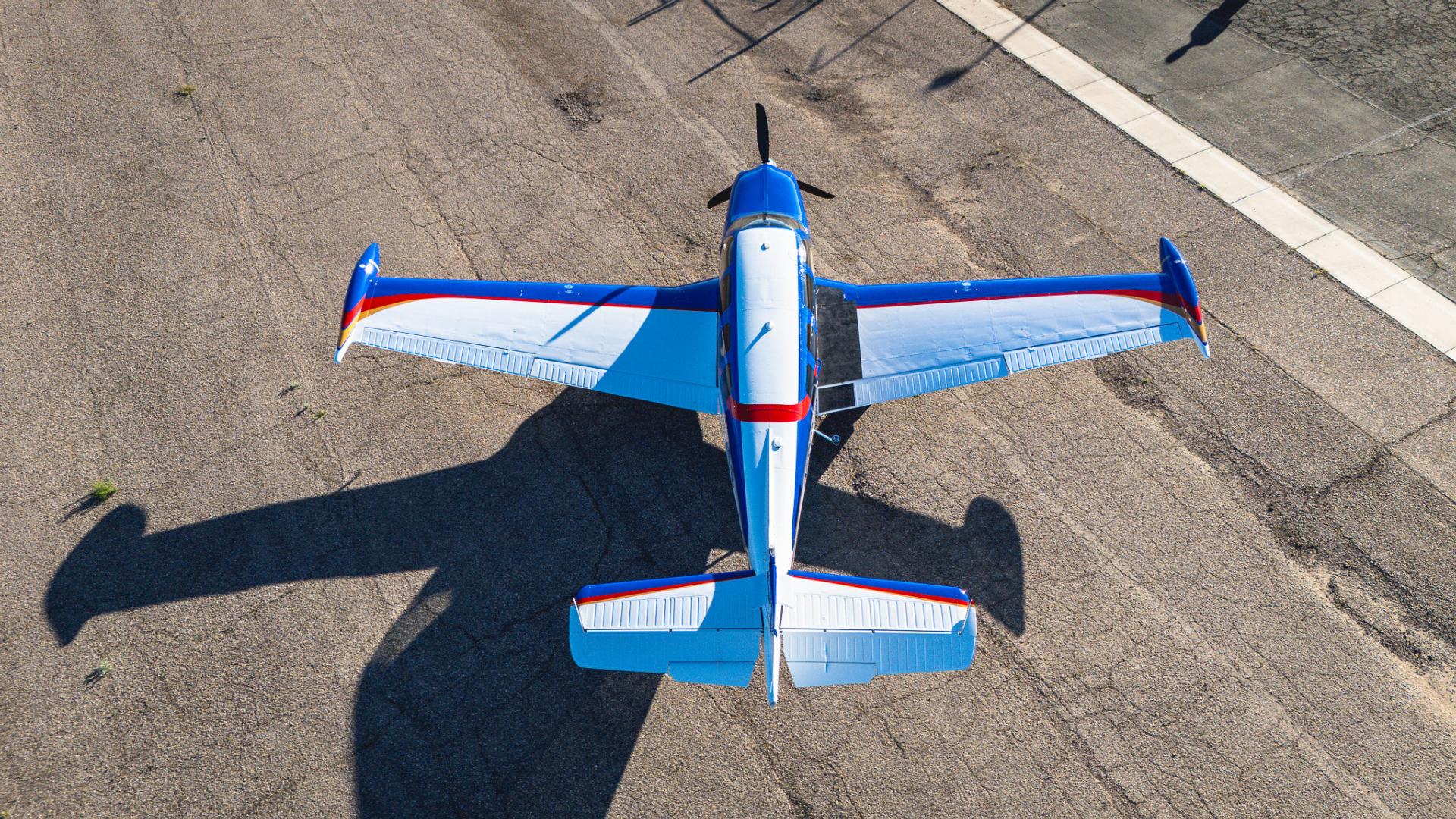 Painted March 2026. Our photographer had to wait for the paint to dry to capture this one! Fresh out of Don Copeland's shop at Arizona Aeropainting, this 4-color work of art from our friends at Scheme Designers is the epitome of eye-catching. All done in layers of high-quality Sherwin Williams paint, watch all the heads turning as you taxi onto the ramp. Colors as follows: JetGlo Matternhorn White with AcryGlo Neptune Blue, Red Pepper, and Mojave Gold trim. Aircraft is hangar-stored in AZ and previously lived in central CA valley - no corrosion!