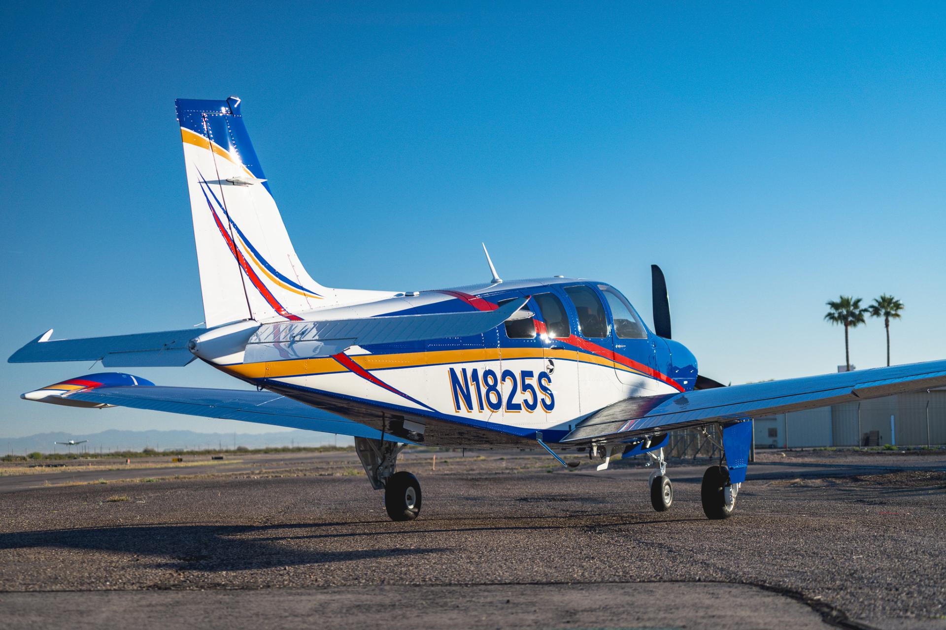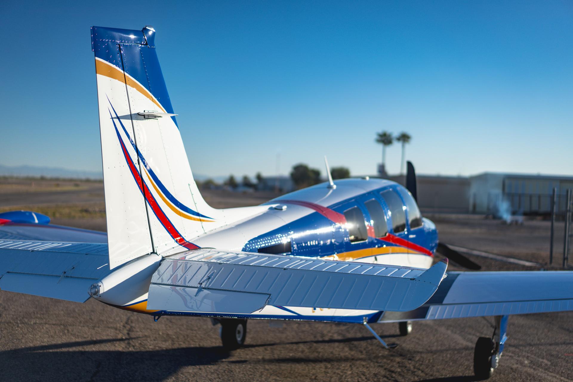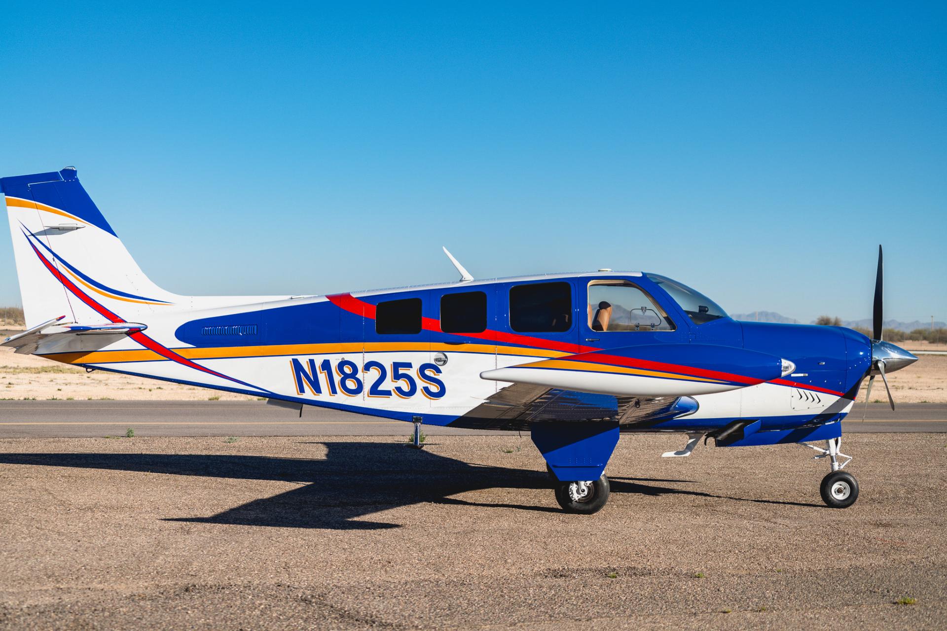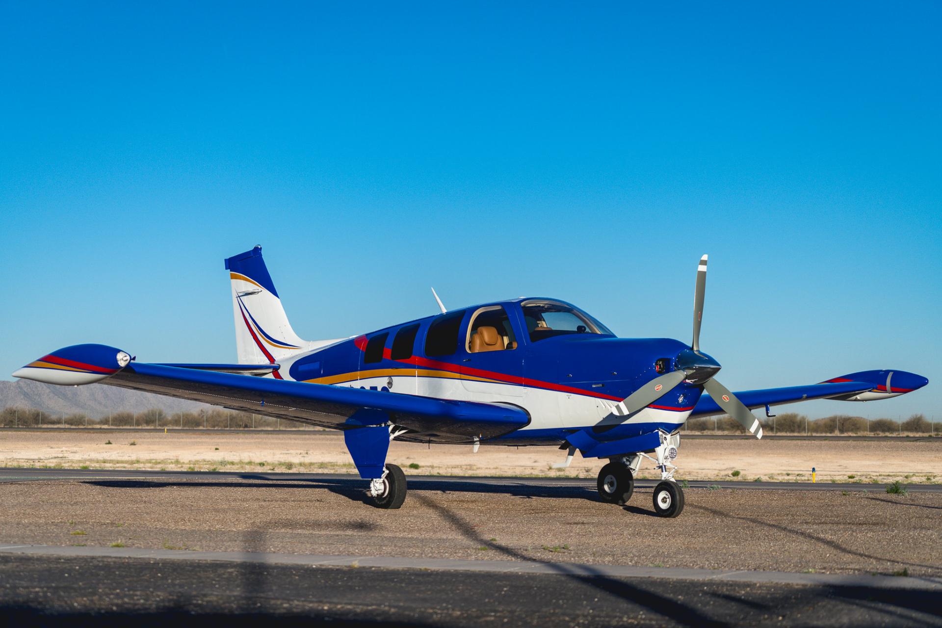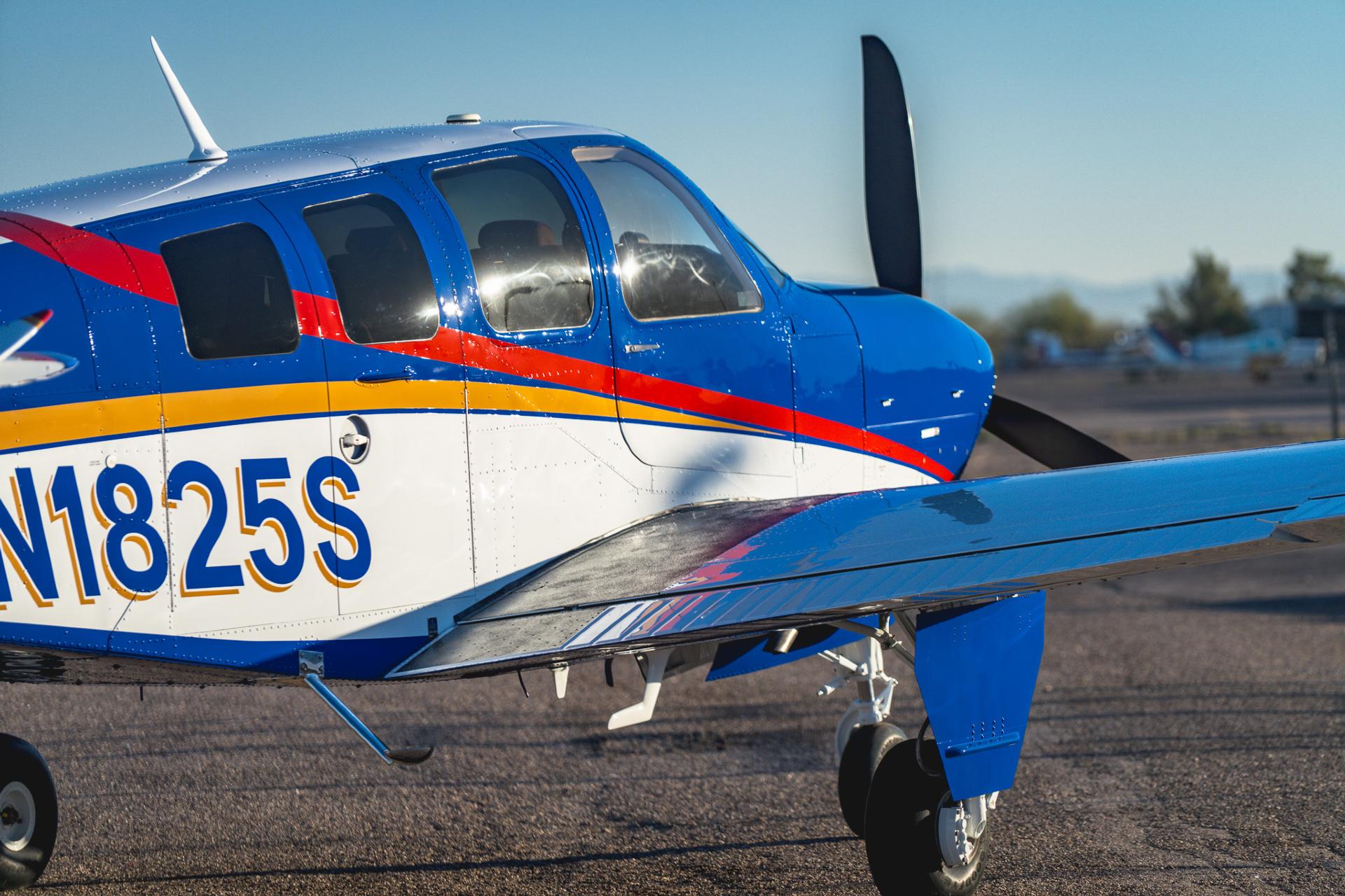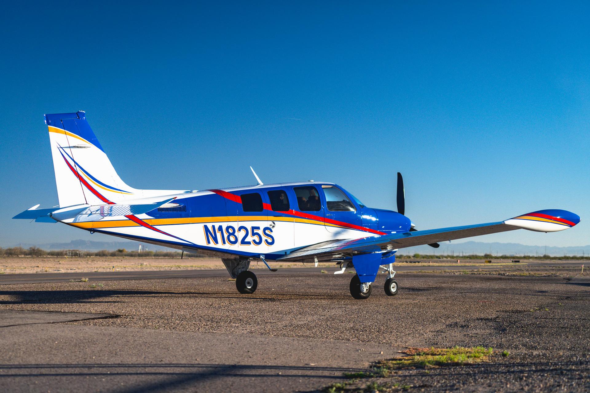 Painted March 2026. Our photographer had to wait for the paint to dry to capture this one! Fresh out of Don Copeland's shop at Arizona Aeropainting, this 4-color work of art from our friends at Scheme Designers is the epitome of eye-catching. All done in layers of high-quality Sherwin Williams paint, watch all the heads turning as you taxi onto the ramp. Colors as follows: JetGlo Matternhorn White with AcryGlo Neptune Blue, Red Pepper, and Mojave Gold trim. Aircraft is hangar-stored in AZ and previously lived in central CA valley - no corrosion!