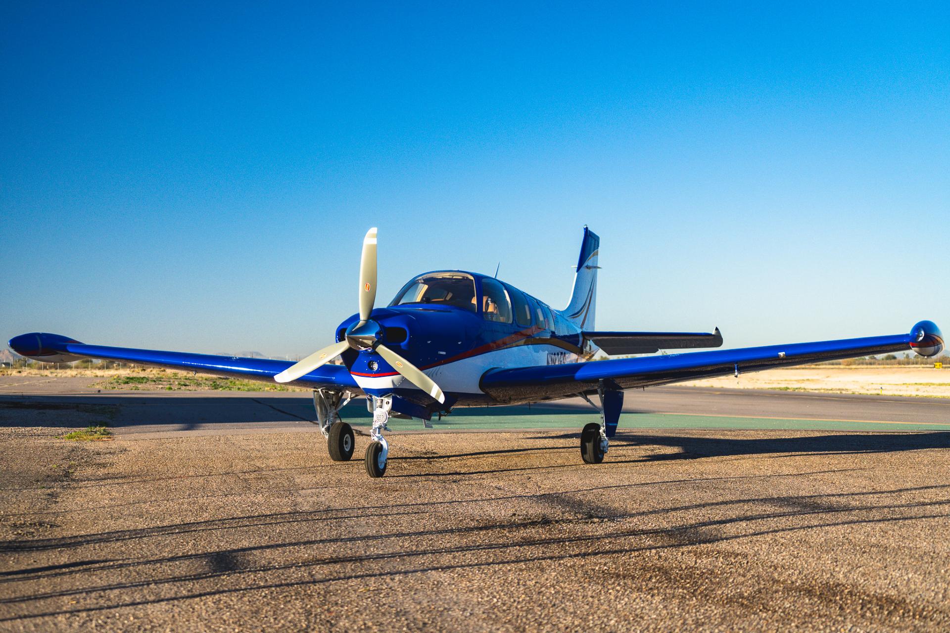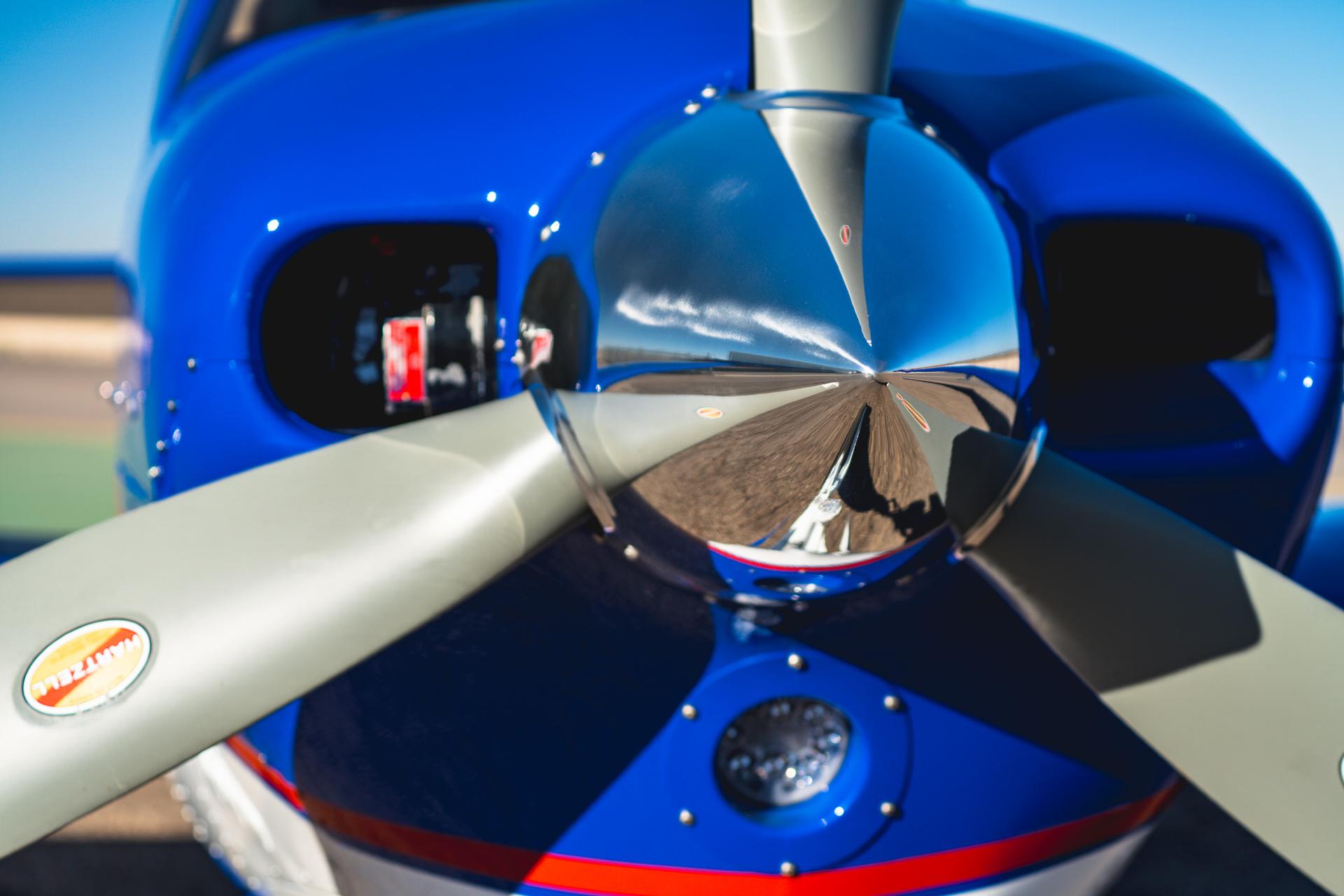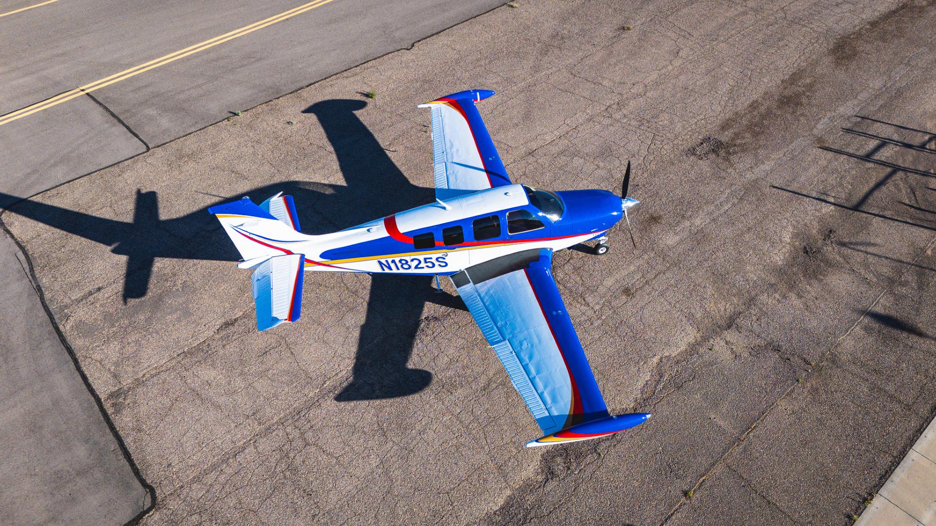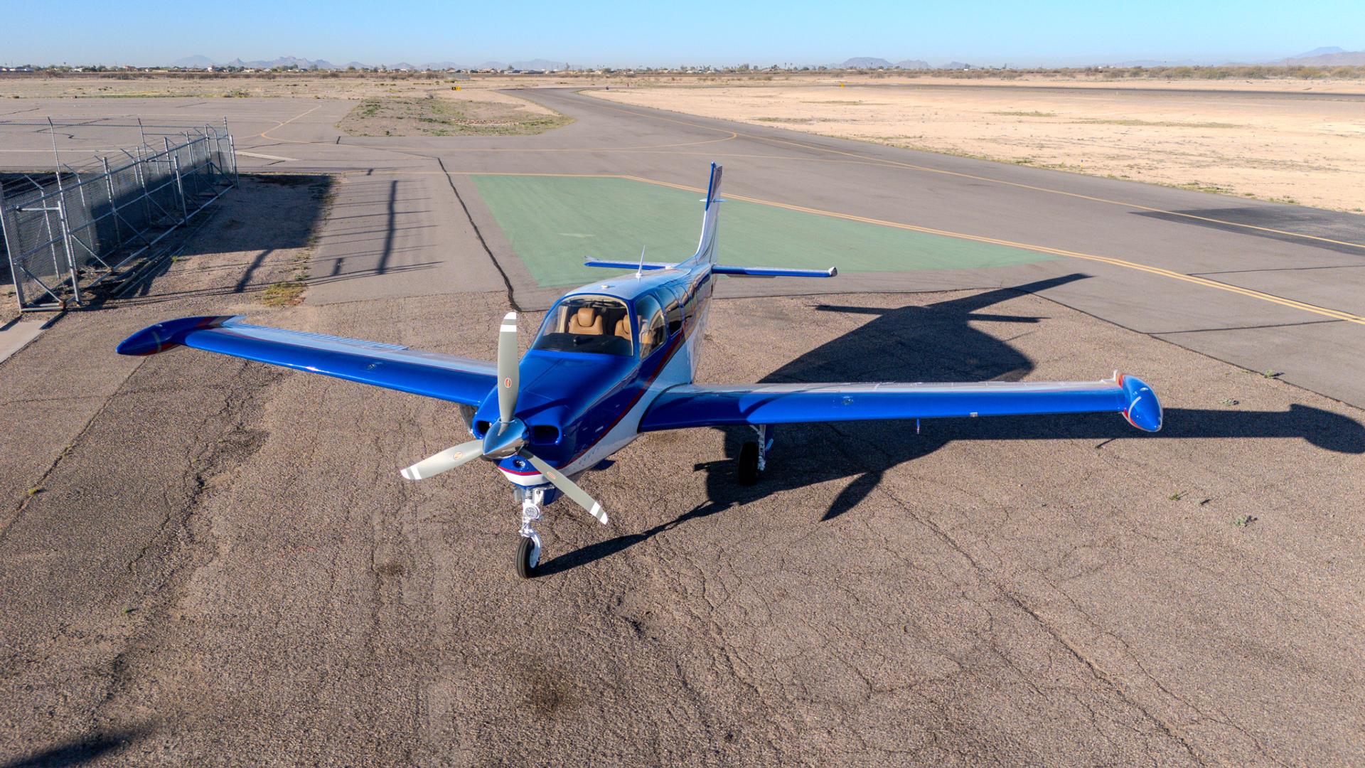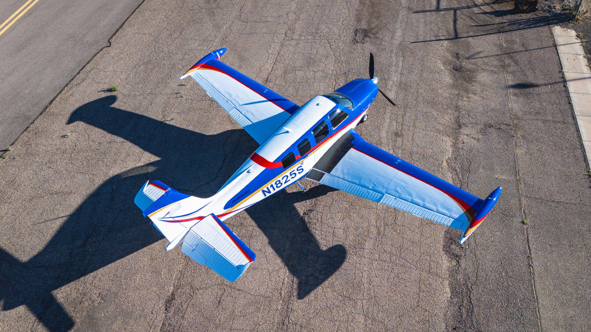 Painted March 2026. Our photographer had to wait for the paint to dry to capture this one! Fresh out of Don Copeland's shop at Arizona Aeropainting, this 4-color work of art from our friends at Scheme Designers is the epitome of eye-catching. All done in layers of high-quality Sherwin Williams paint, watch all the heads turning as you taxi onto the ramp. Colors as follows: JetGlo Matternhorn White with AcryGlo Neptune Blue, Red Pepper, and Mojave Gold trim. Aircraft is hangar-stored in AZ and previously lived in central CA valley - no corrosion!