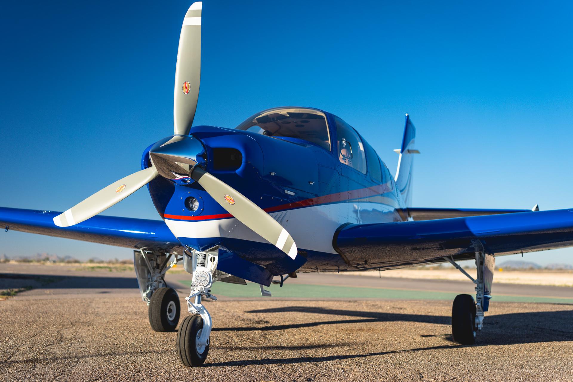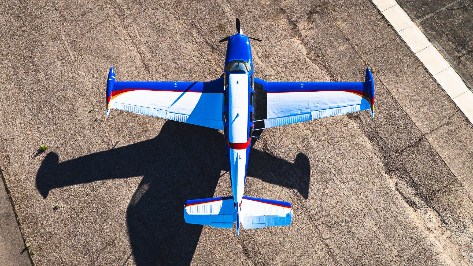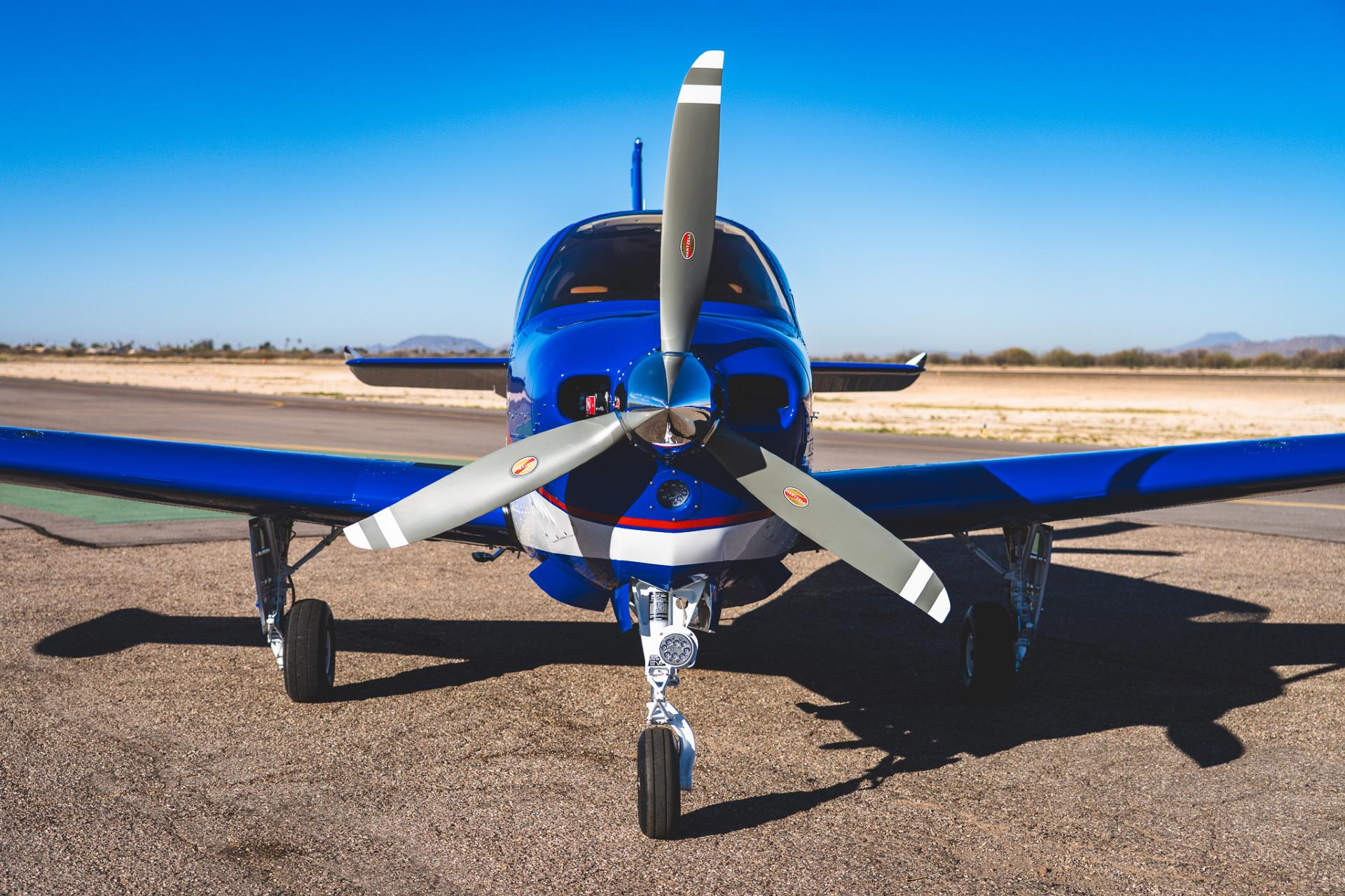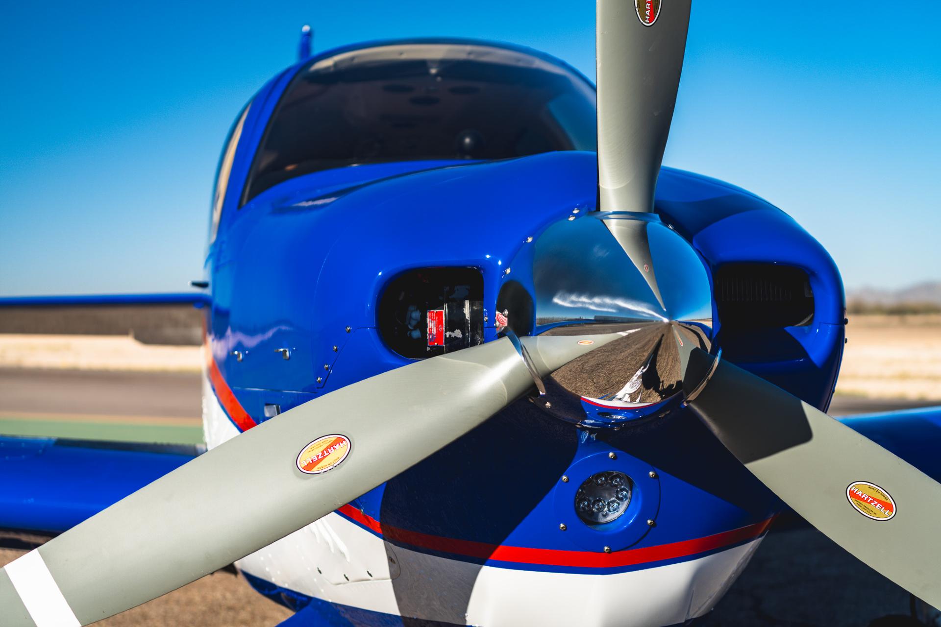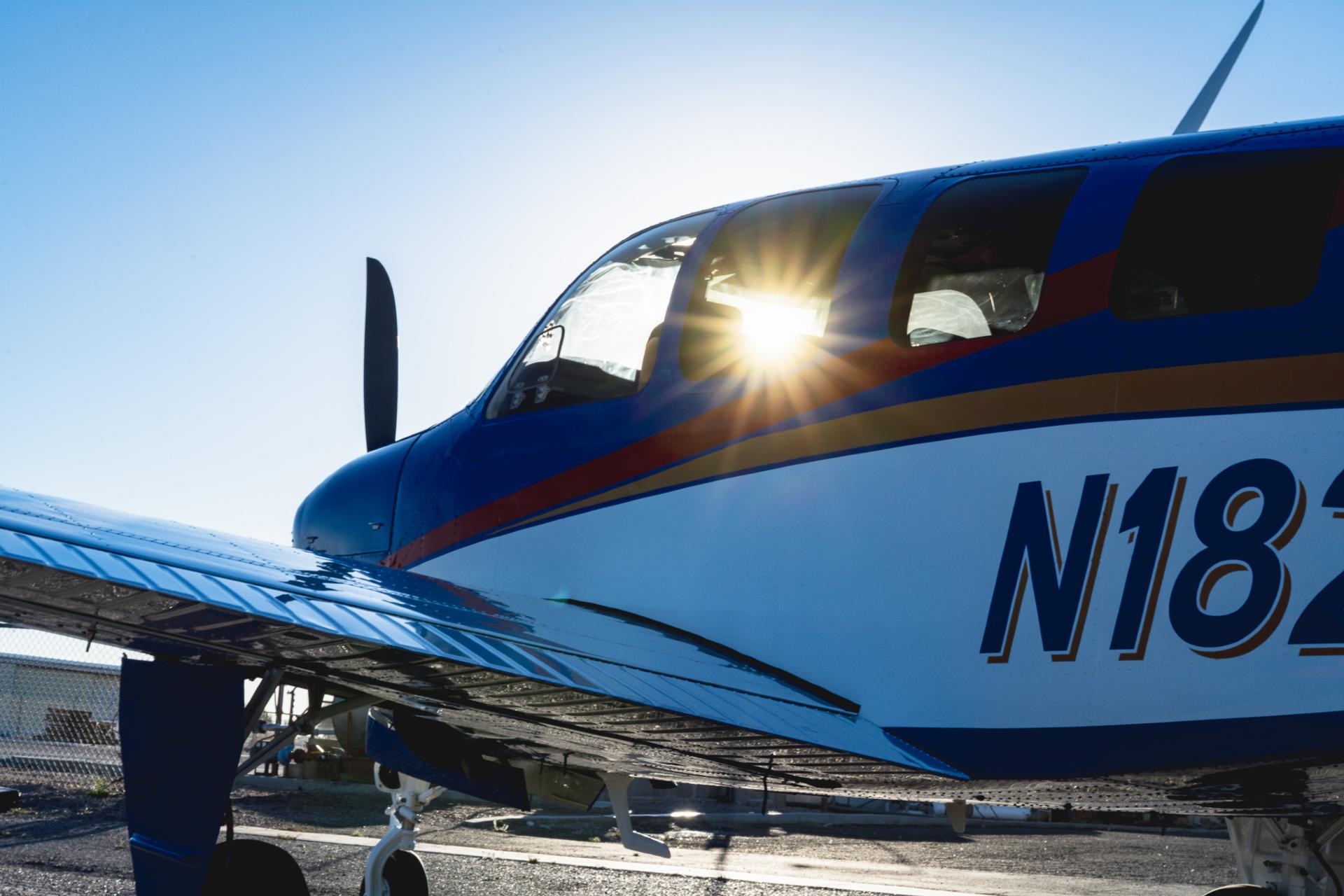 Painted March 2026. Our photographer had to wait for the paint to dry to capture this one! Fresh out of Don Copeland's shop at Arizona Aeropainting, this 4-color work of art from our friends at Scheme Designers is the epitome of eye-catching. All done in layers of high-quality Sherwin Williams paint, watch all the heads turning as you taxi onto the ramp. Colors as follows: JetGlo Matternhorn White with AcryGlo Neptune Blue, Red Pepper, and Mojave Gold trim. Aircraft is hangar-stored in AZ and previously lived in central CA valley - no corrosion!