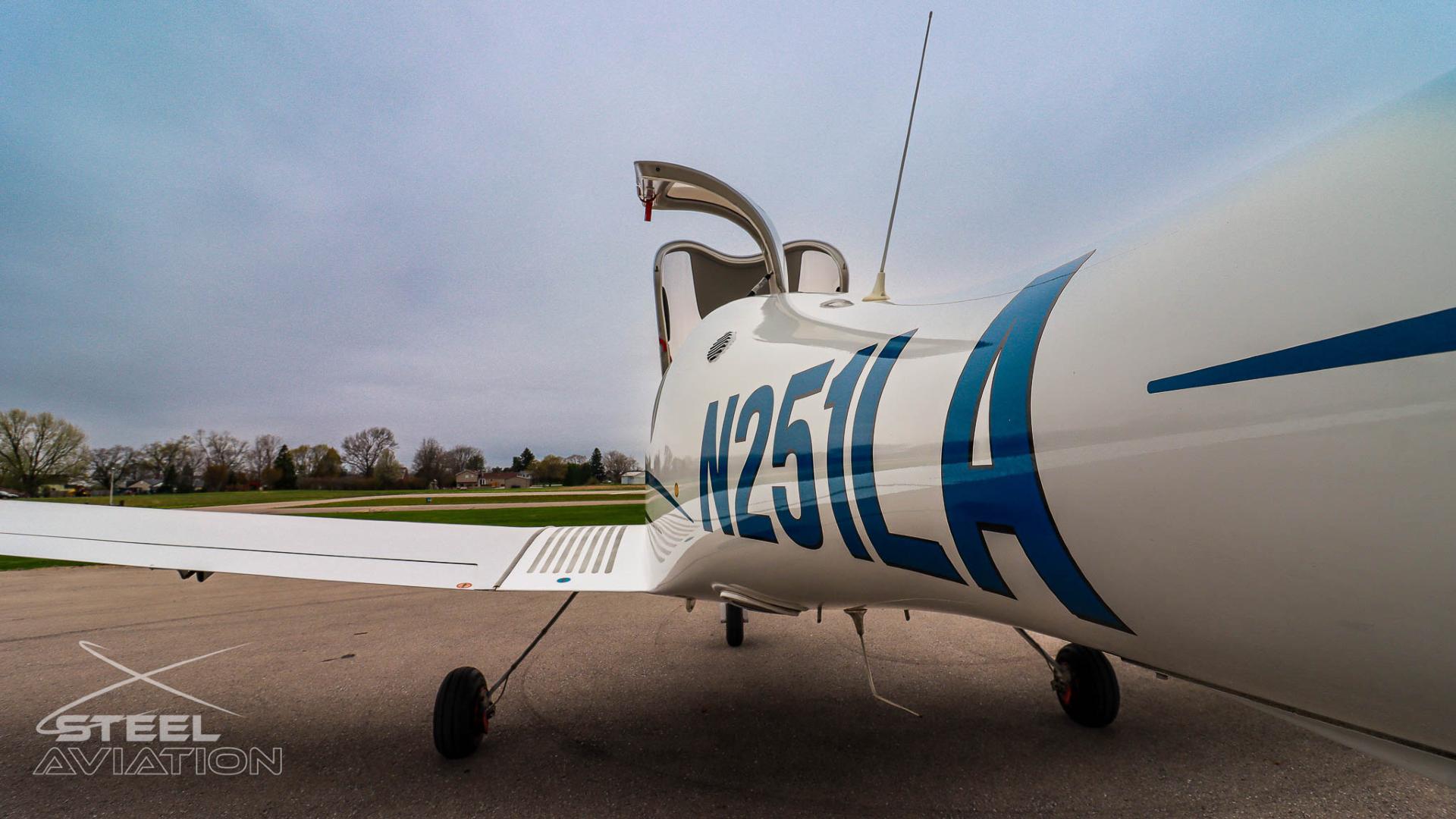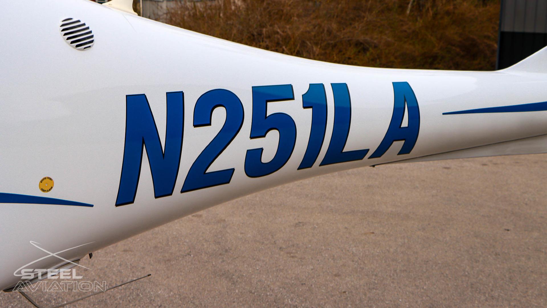 The exterior of N251LA looks fantastic, with a clean, glossy white base and sharp blue vinyl accents that really bring the airplane to life. The striping flows nicely along the fuselage and tail, giving it a sporty, modern look even when it’s sitting still.